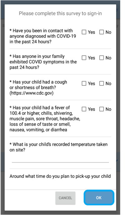 3. Si se te solicita completar una encuesta de ingreso/salida, llena los campos requeridos y selecciona Aceptar.