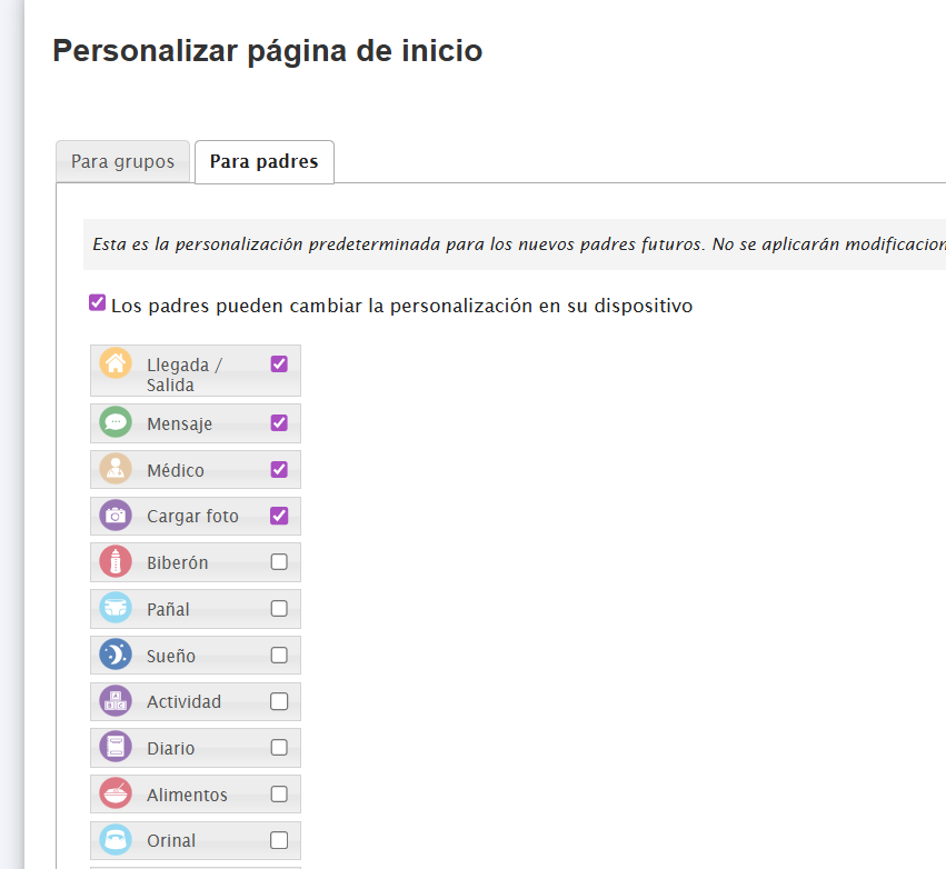 Al personalizar la página de inicio, puedes agregar, eliminar y reorganizar las categorías de entradas que aparecen en ella. Al personalizar las etiquetas, puedes cambiar el título de cada entrada y la forma en que dicha entrada aparecerá en la línea de tiempo de tu hijo(a).