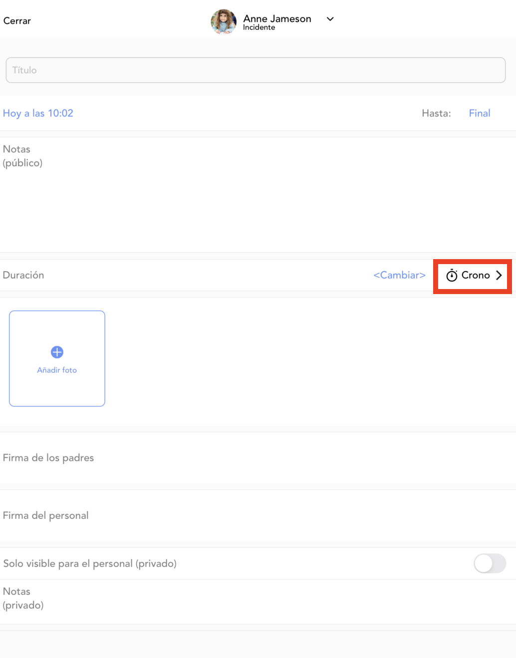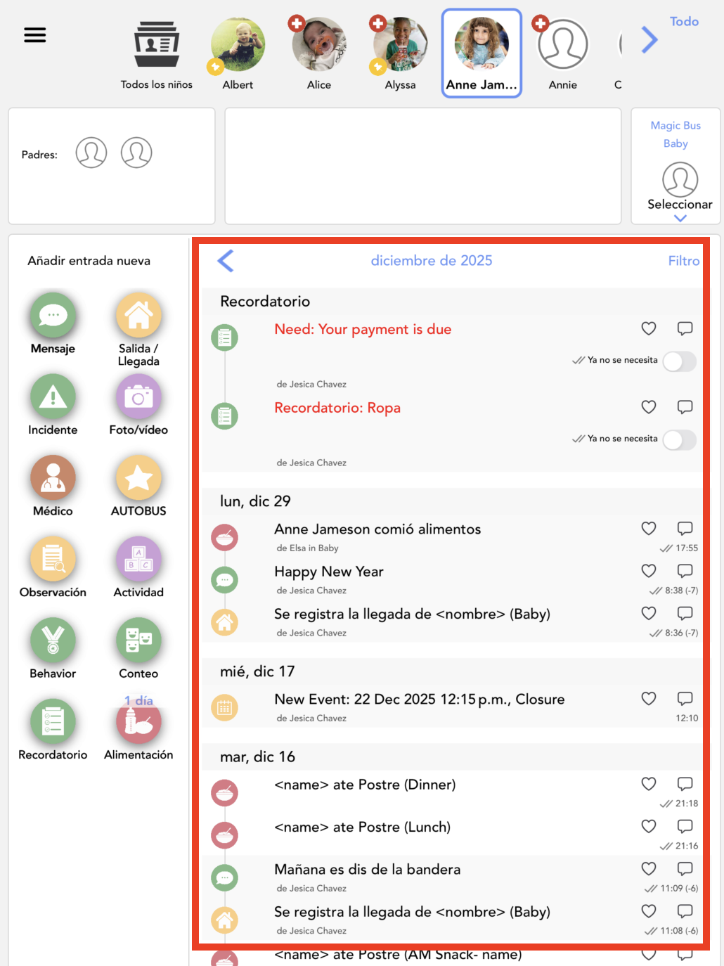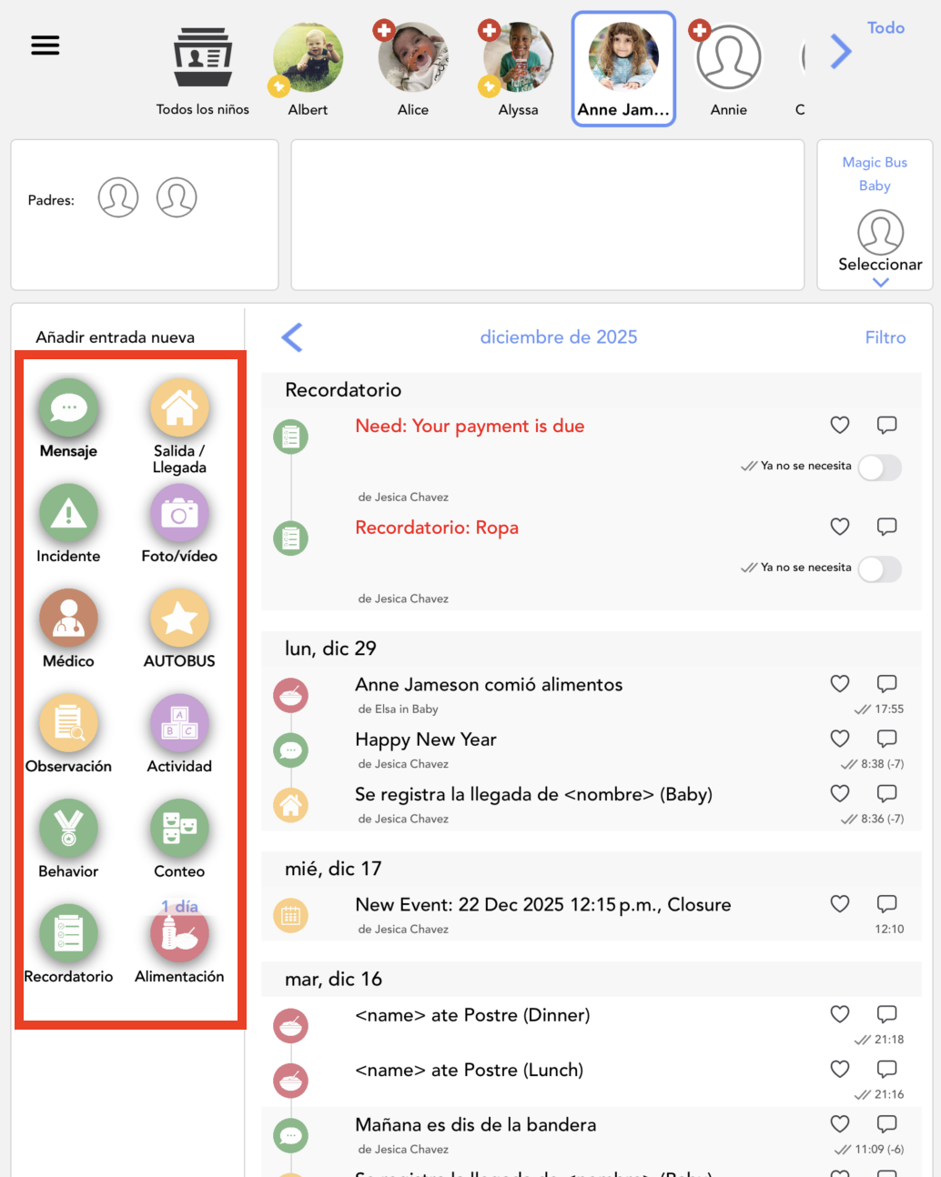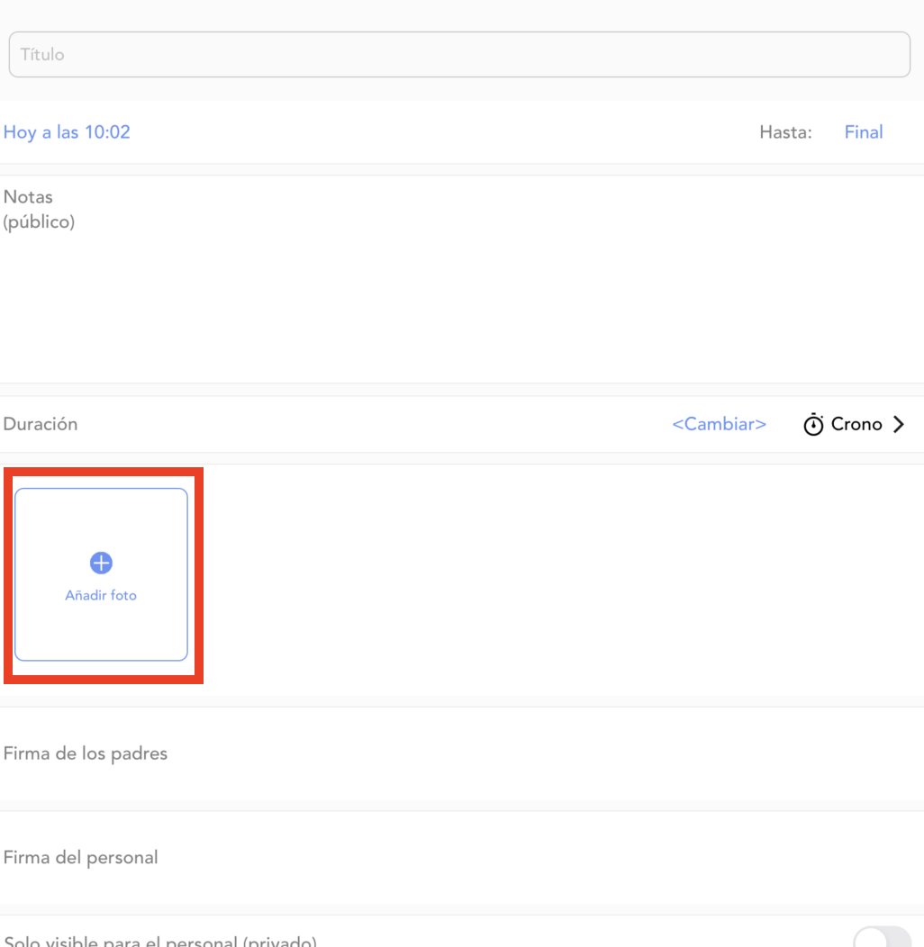 Las fotos solo se pueden agregar a entradas de sólido, pañal, actividad, informe de incidentes, subir foto, diario, hito, salud, orinal, medicación y observación.