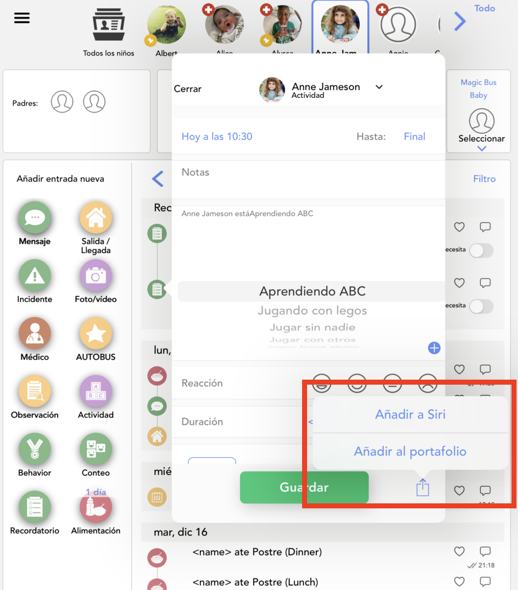 6. Marque la casilla Añadir al portafolio para añadir la entrada al portafolio del niño.