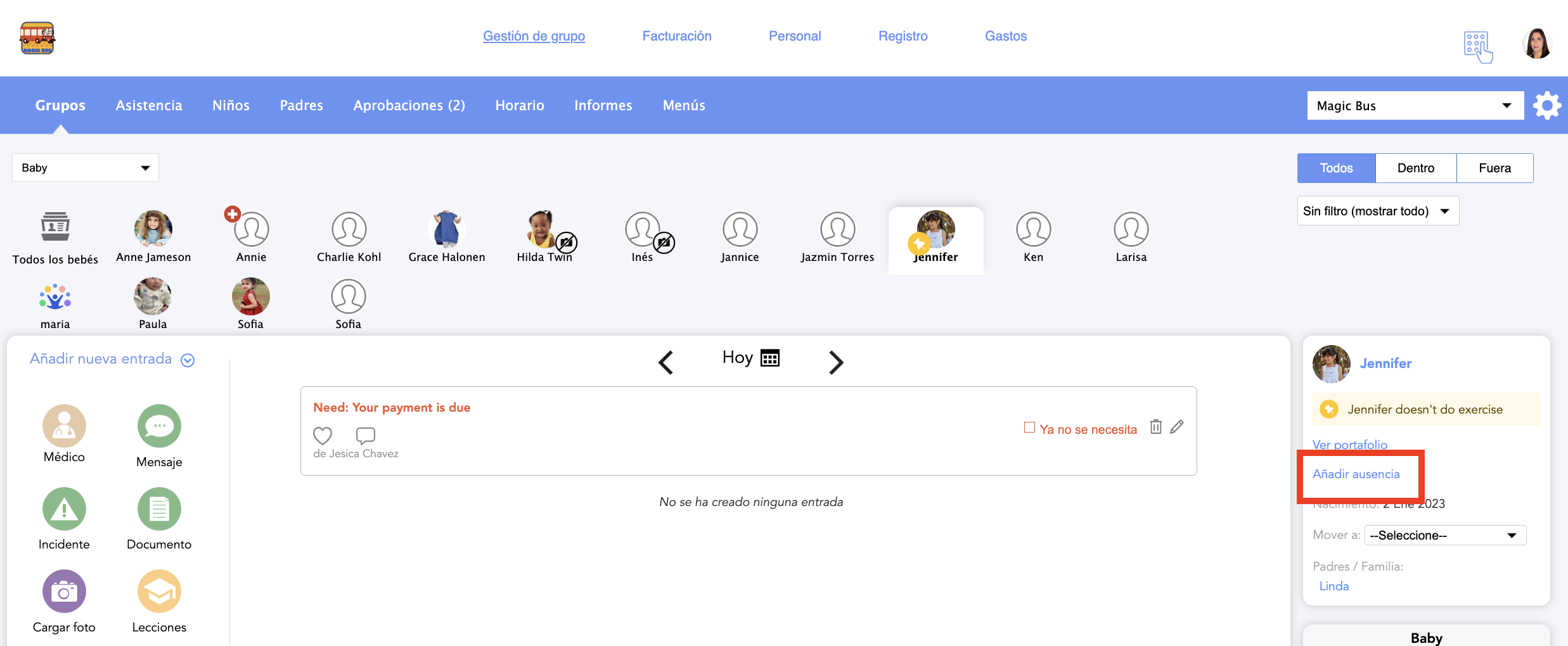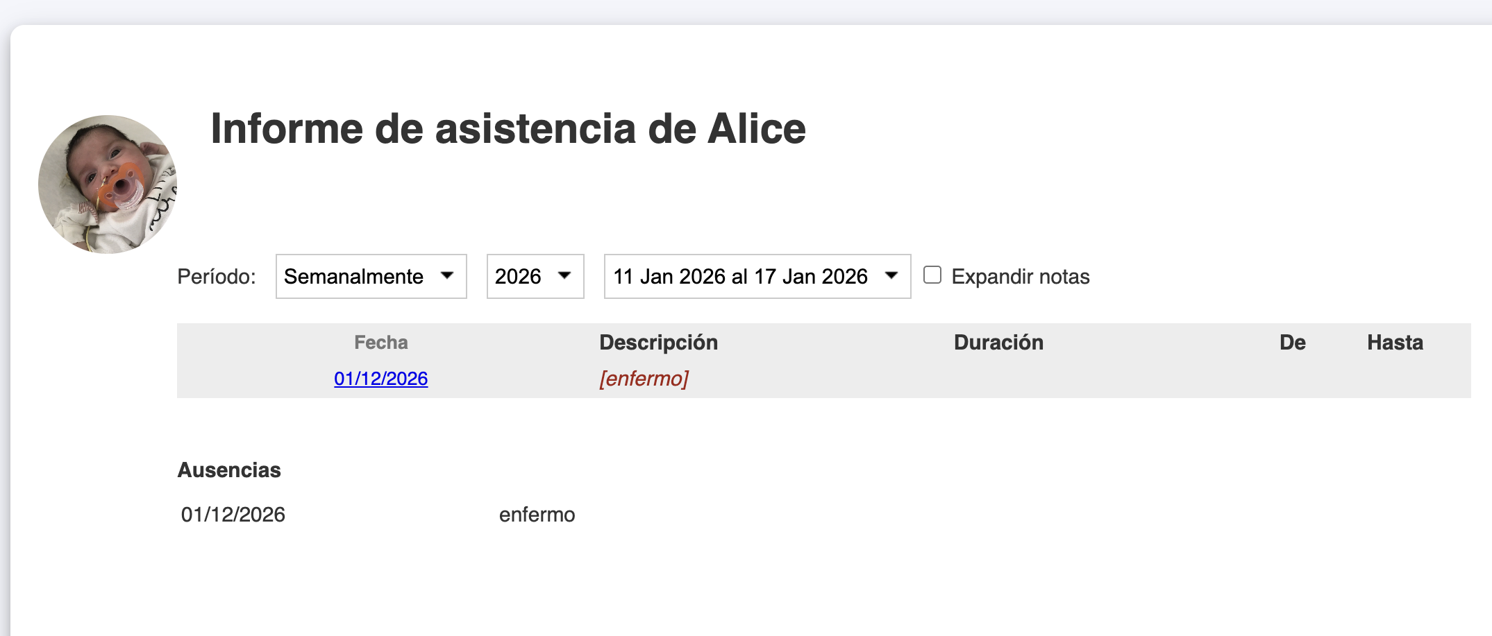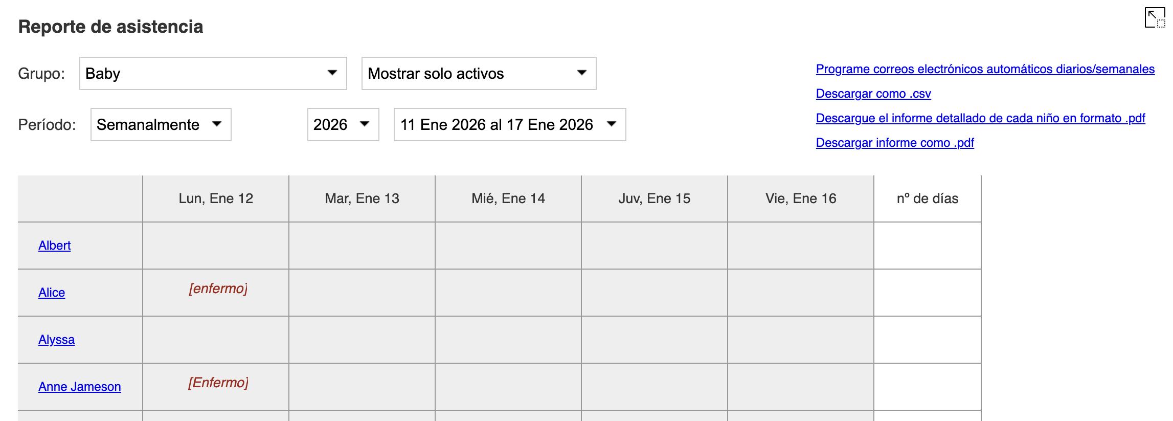 Las ausencias se utilizan en los Informes de Asistencia con un mensaje en rojo en los días en que el niño estuvo ausente, y en los informes individuales de asistencia de cada niño, dentro de la sección "Ausencias".