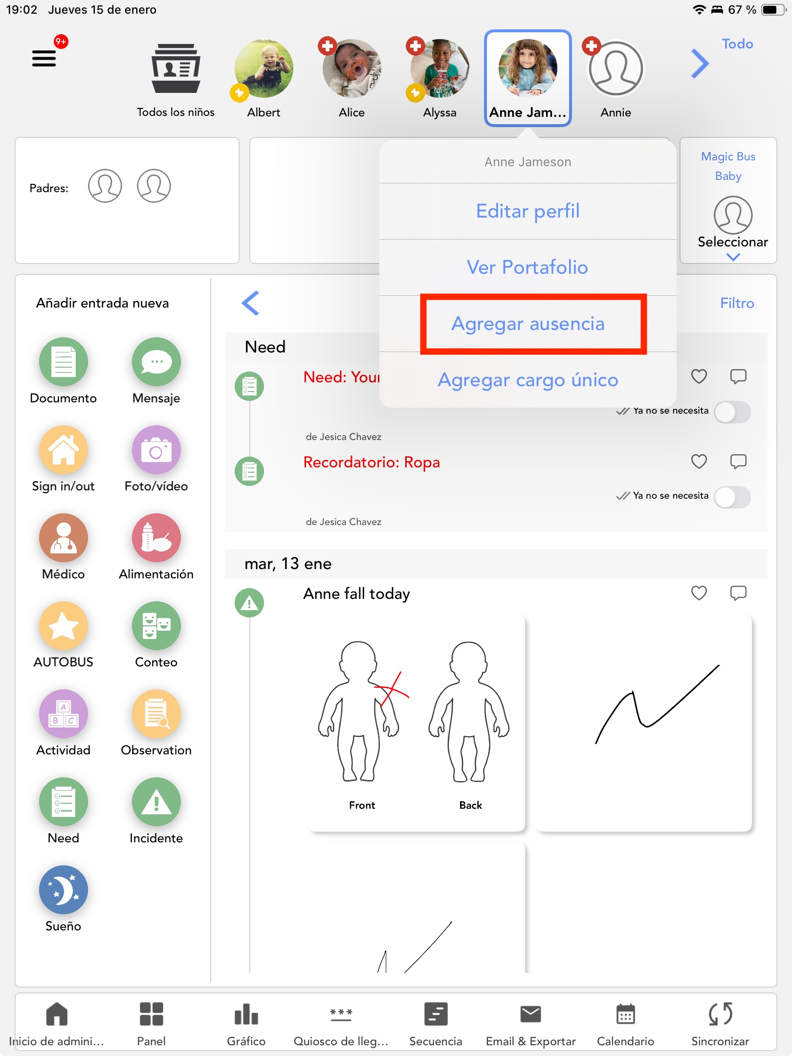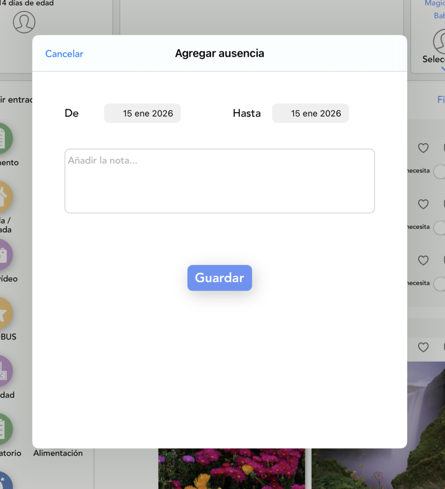 Toca la foto del niño en la parte superior de la pantalla y luego selecciona "Agregar Ausencia" para ingresar un nuevo período de ausencia.
