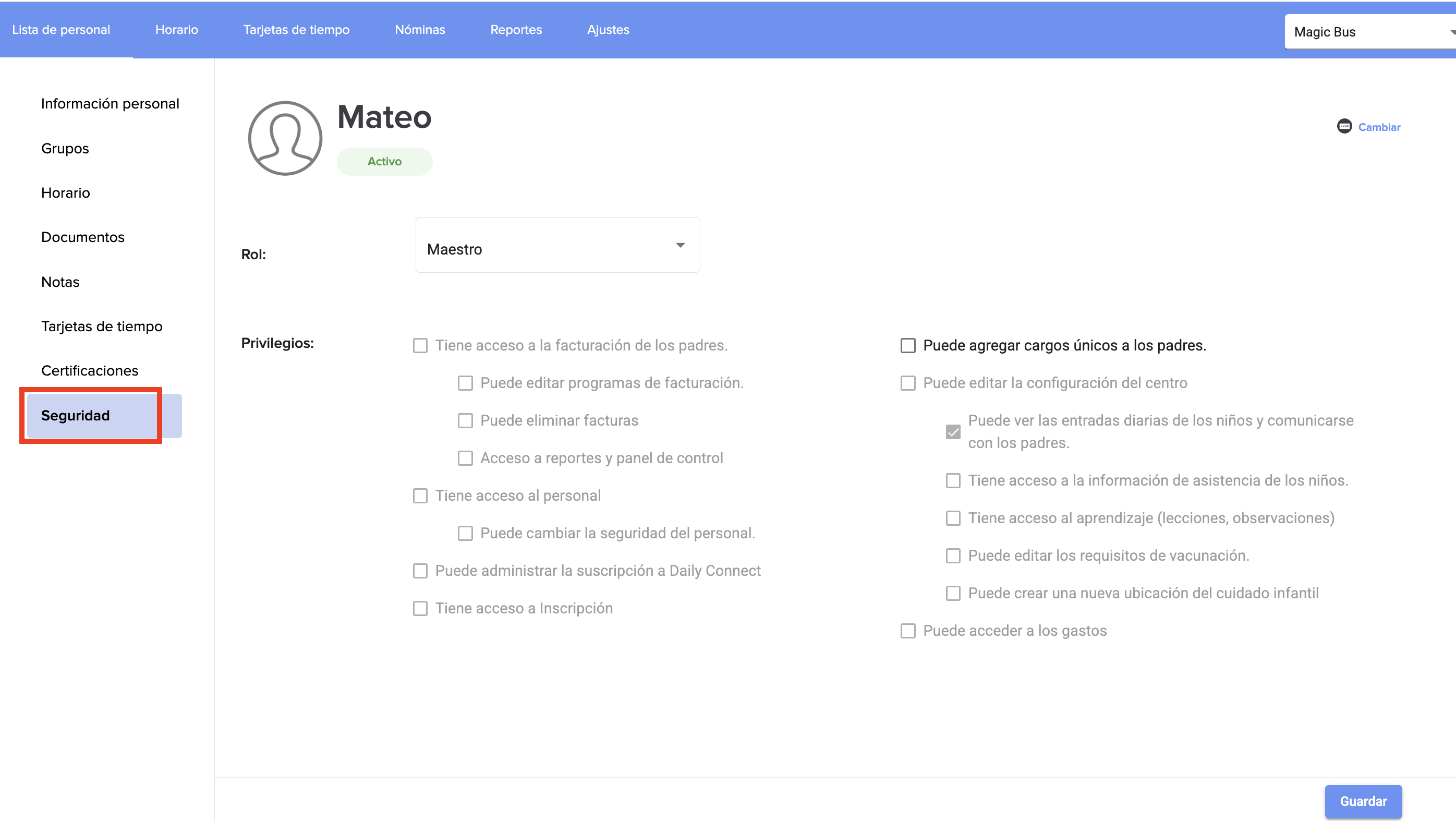 Si desea cambiar los permisos de un perfil de usuario concreto vaya a la sección de Seguridad del perfil en específico que desea modificar: