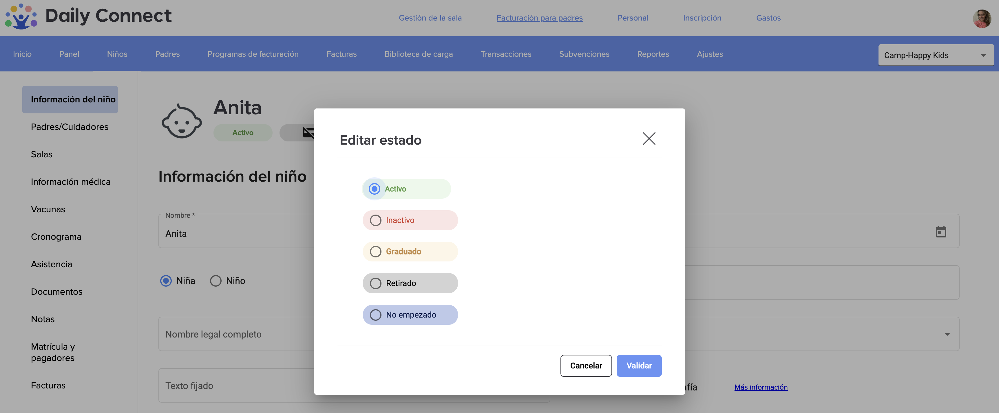 Para cambiar el estado de un perfil de niño/a a Inactivo (o a cualquier otro, ve a la página del niño/a desde el menú: Niños > [Nombre del niño/a], y haz clic en el botón verde que dice Activo, ubicado en la parte superior de la página.