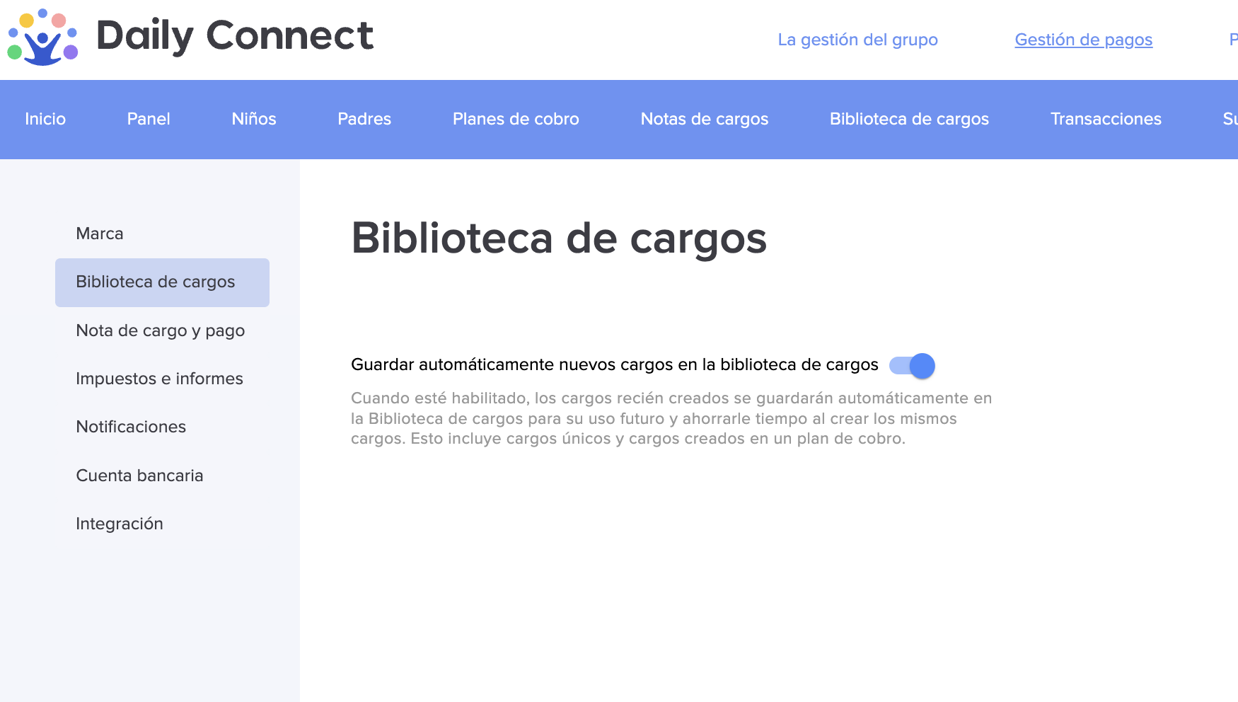 En la pestaña Biblioteca de cargos, puede activar la opción para que se guarde automáticamente cada cargo que cree.