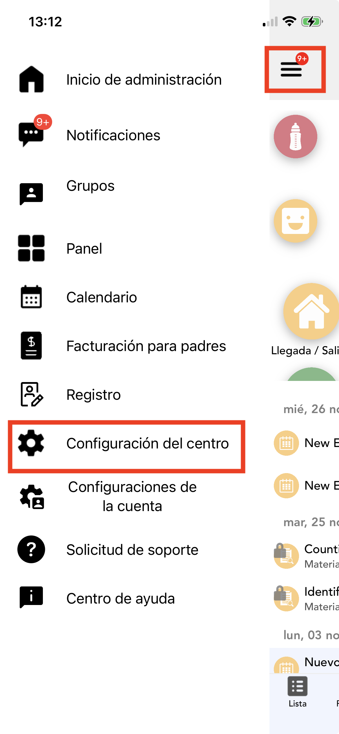Puedes acceder al Nuevo Panel de Administración desde el menú superior de la app. Allí acceda a Configuración del centro