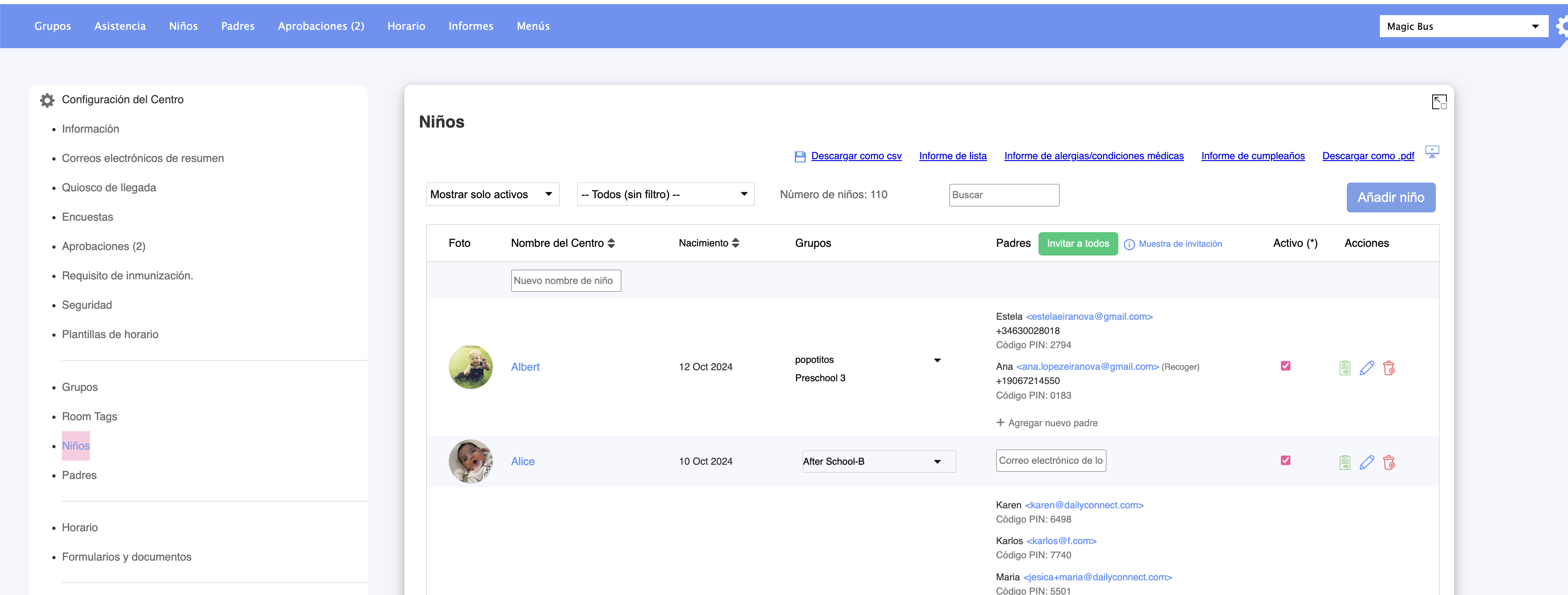 Los niños que tengan un texto fijado se mostrarán con un icono de chinche roja. Al seleccionar al niño, el texto se mostrará claramente en la aplicación.