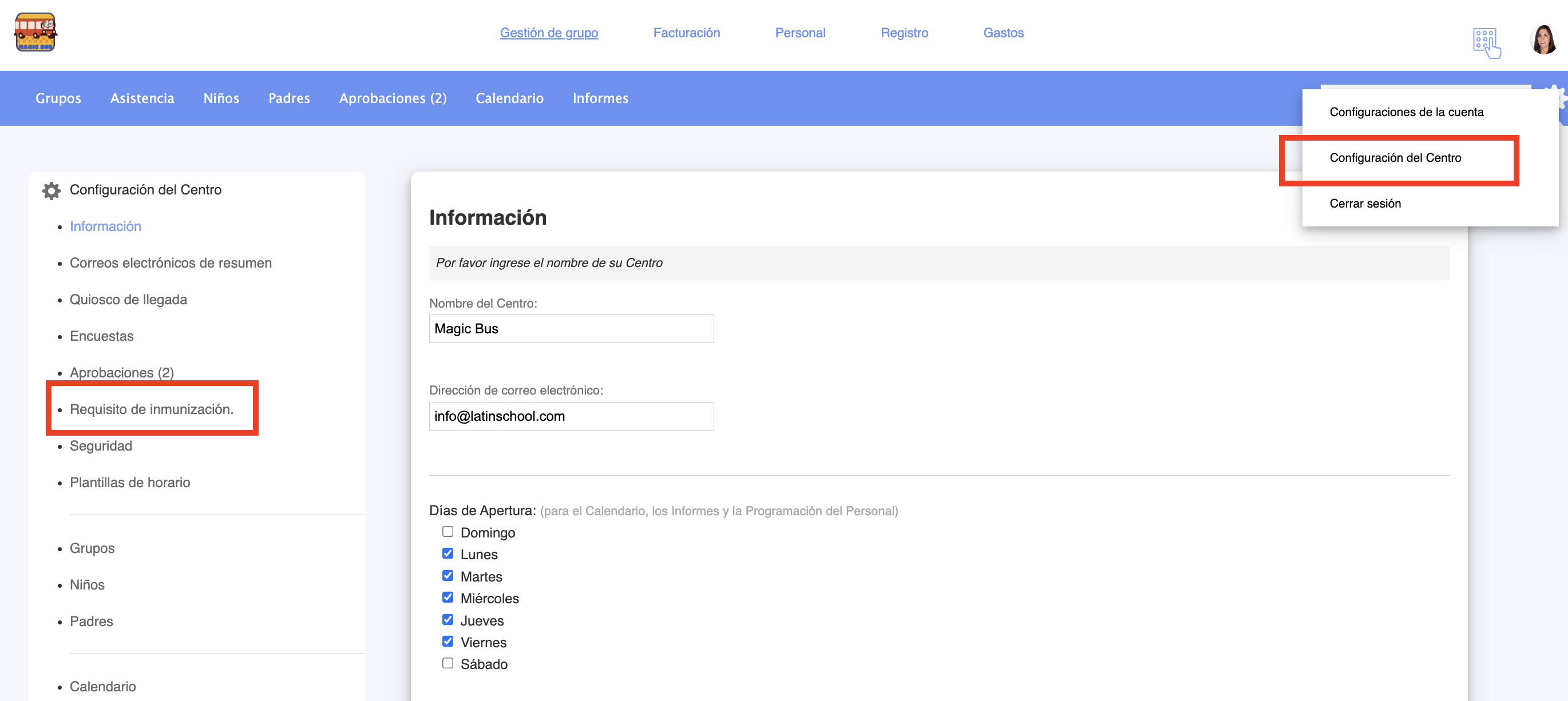 2. Vaya a la configuración del centro y haga clic en Requisito de inmunización: