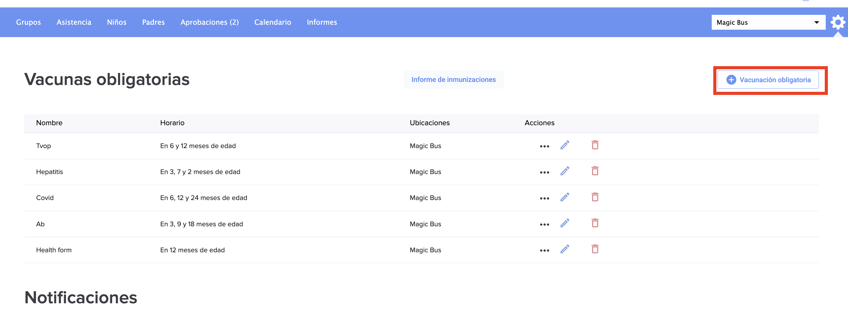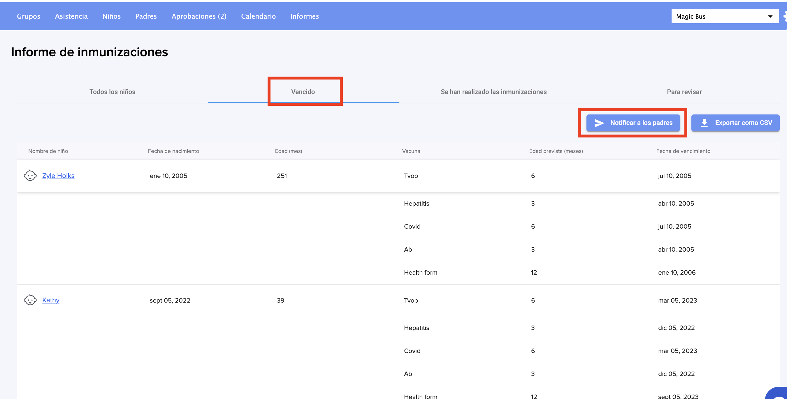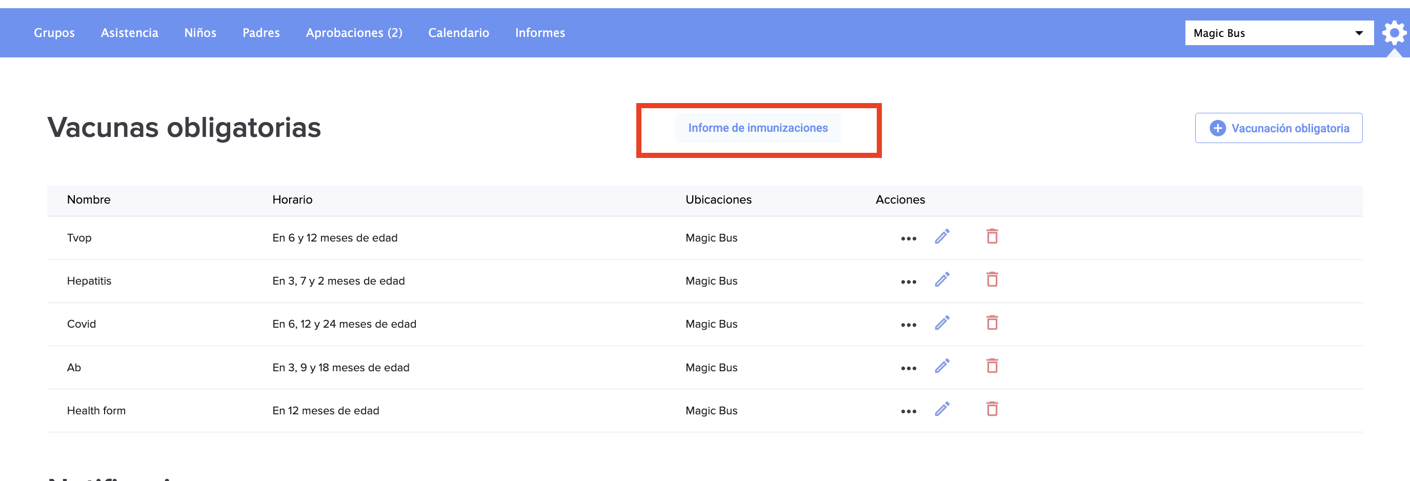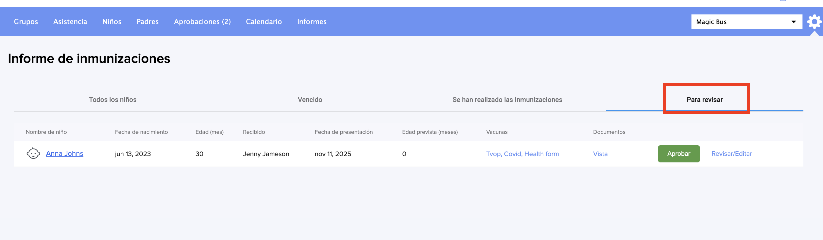Una vez que el padre envíe la inmunización, recibirá una notificación (habilite las notificaciones desde la página de Inmunizaciones Requeridas). También puede aprobar las inmunizaciones desde la sección de Informe de inmunizaciones > Vencida, como le indicamos anteriormente.
