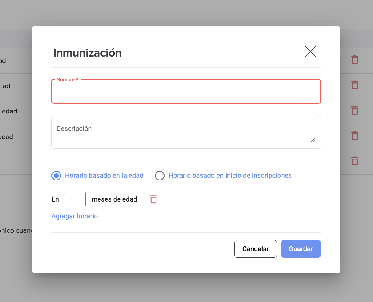 Puede agregar diferentes momentos de la vida del niño en la que esta vacunación puede ser requerida.