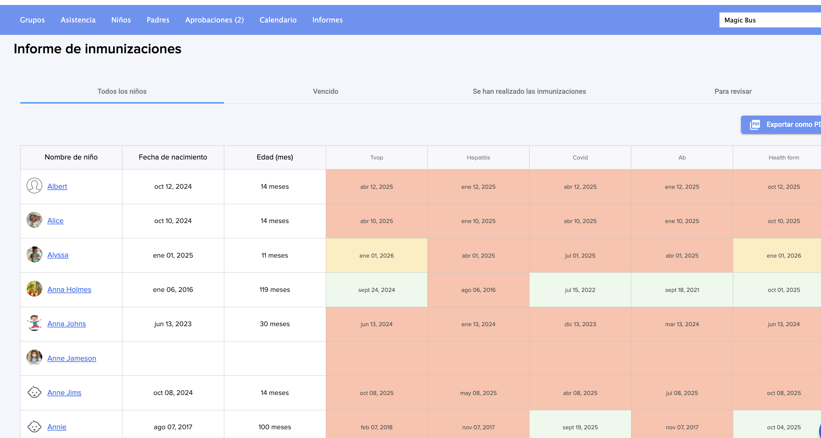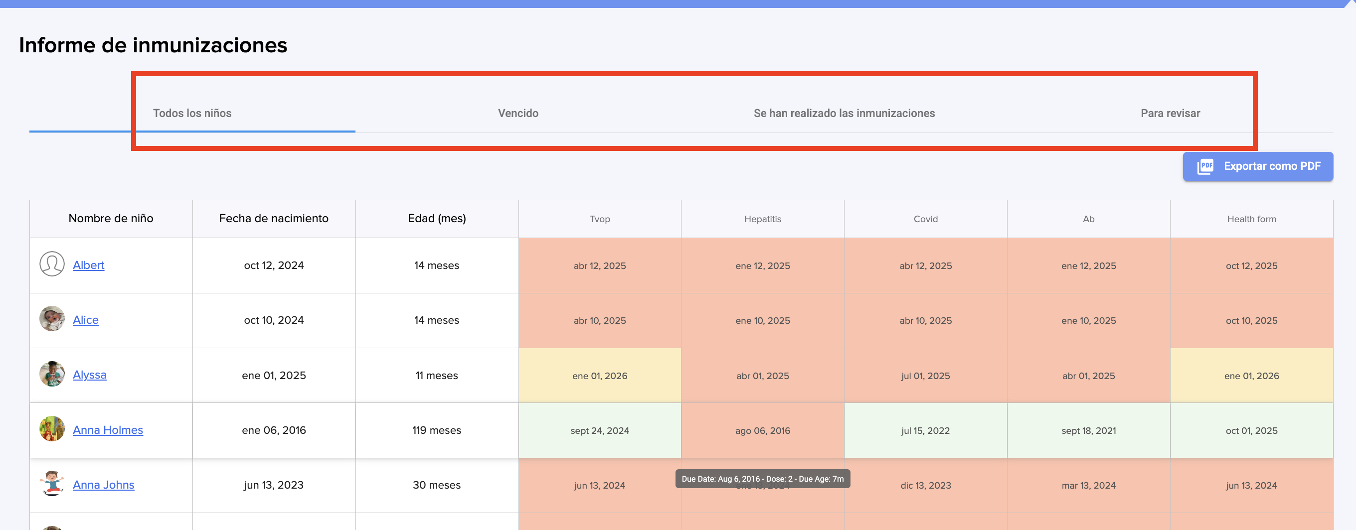 Un informe es una forma fácil de ver qué niños tienen inmunizaciones vencidas, qué inmunizaciones han sido enviadas por los padres y necesitan ser revisadas, o para obtener la documentación de todas las inmunizaciones realizadas para todos los niños con fines de licenciamiento.