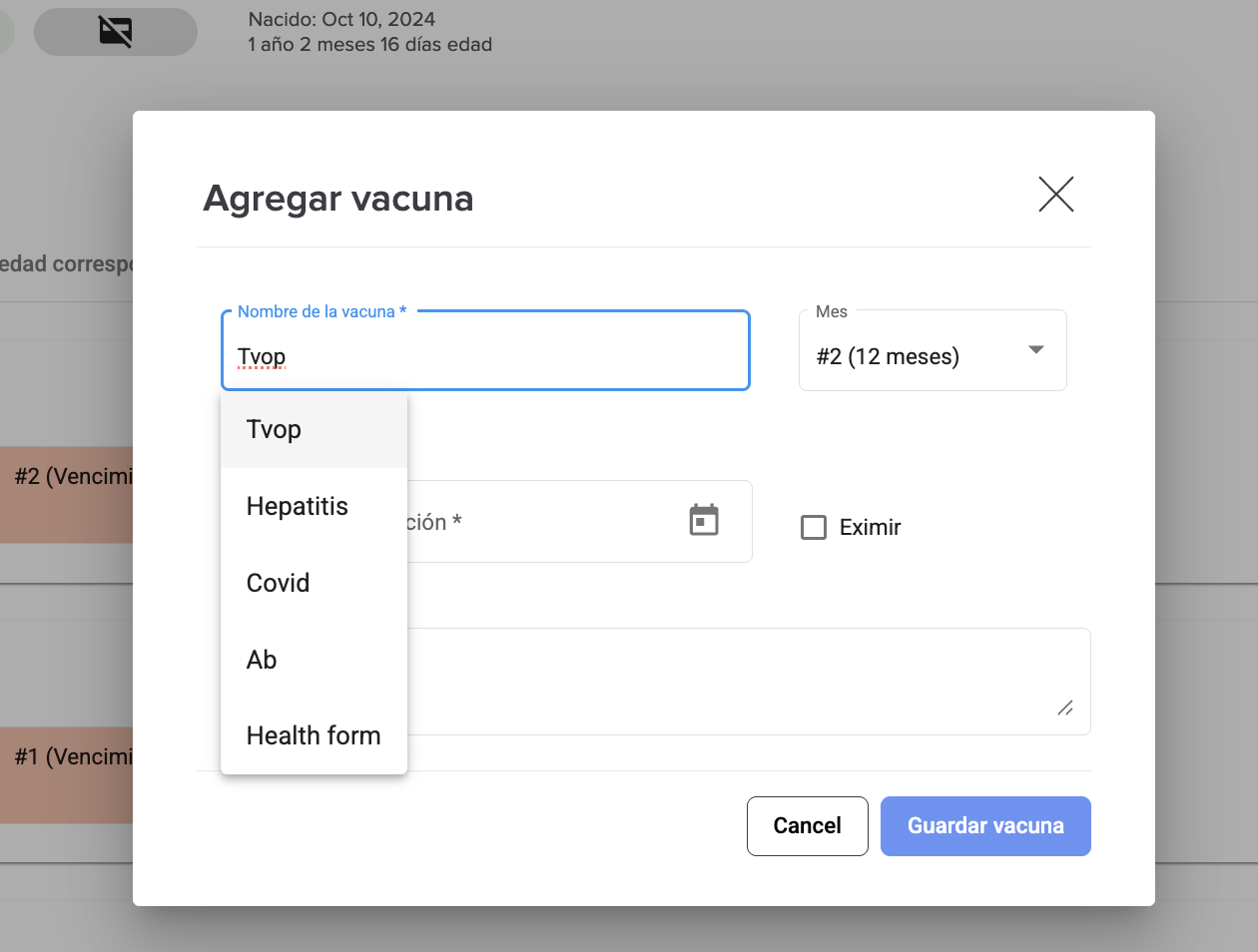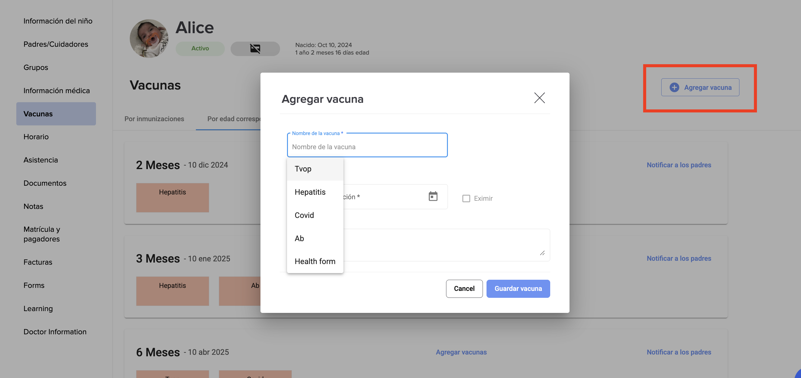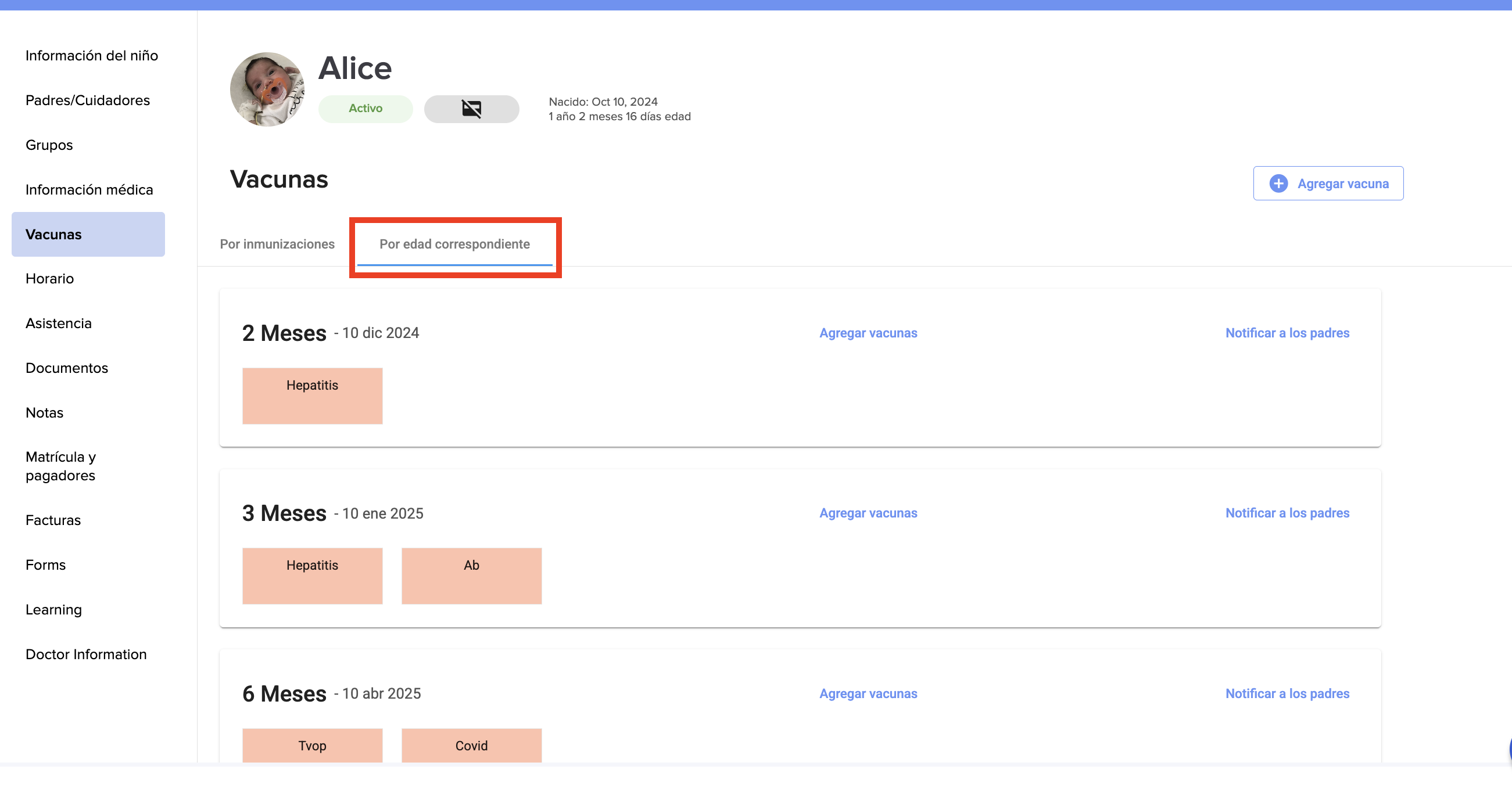 O haciendo clic en “Agregar Vacuna” en la página Por edad correspondiente para ingresar fácilmente todas las inmunizaciones realizadas durante la visita al pediatra.