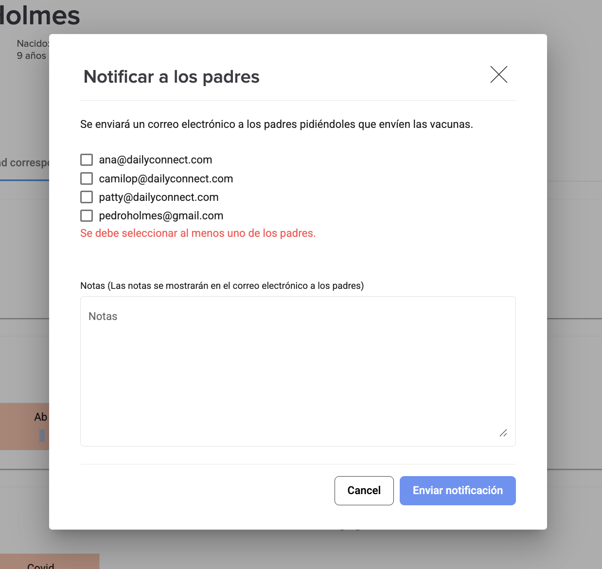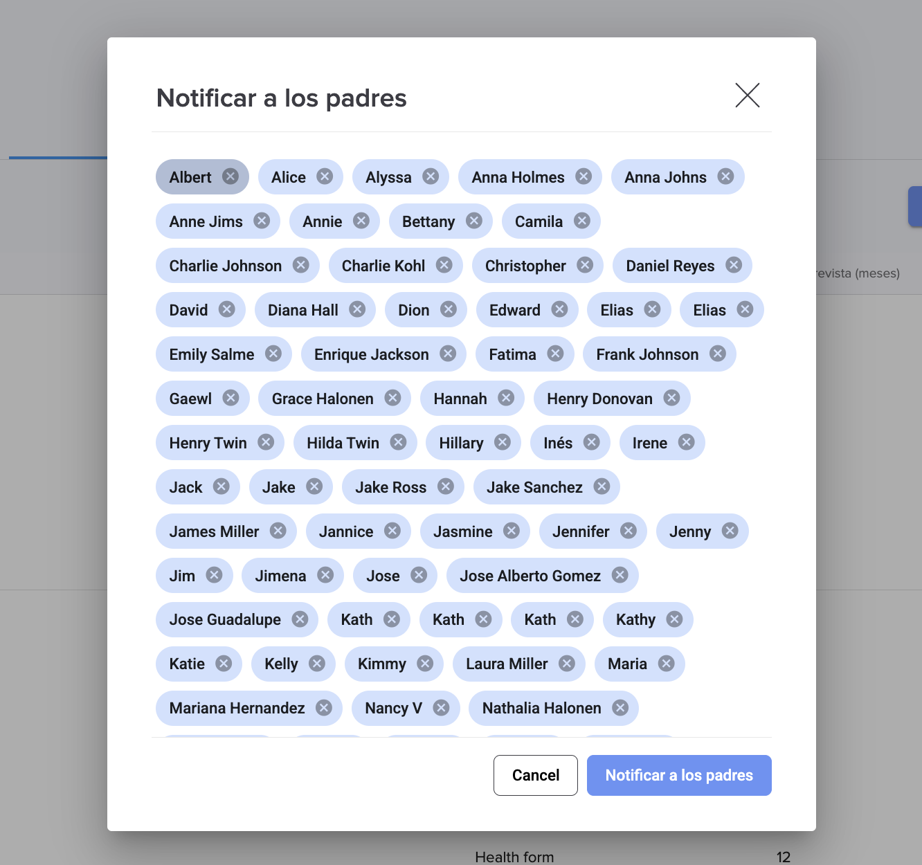 Aquí puede eliminar a los padres a los que no desea enviar notificaciones. Después haga clic en Notificar a los padres