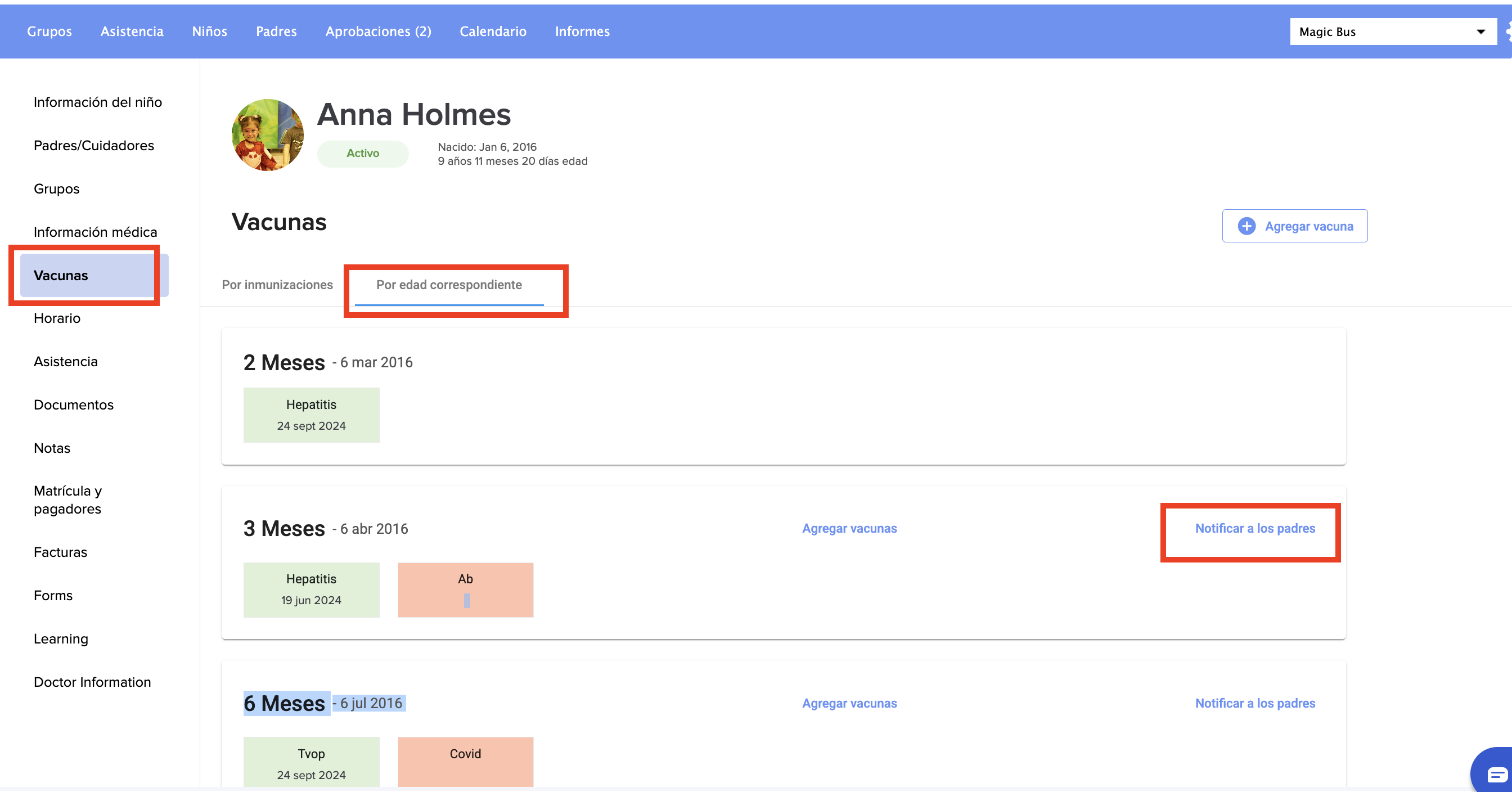 Otra forma de notificar a los padres es accediendo al perfil de cada niño. Ahí, en la sección de vacunas vaya a Por edad correspondiente y haga clic en Notificar a los padres: