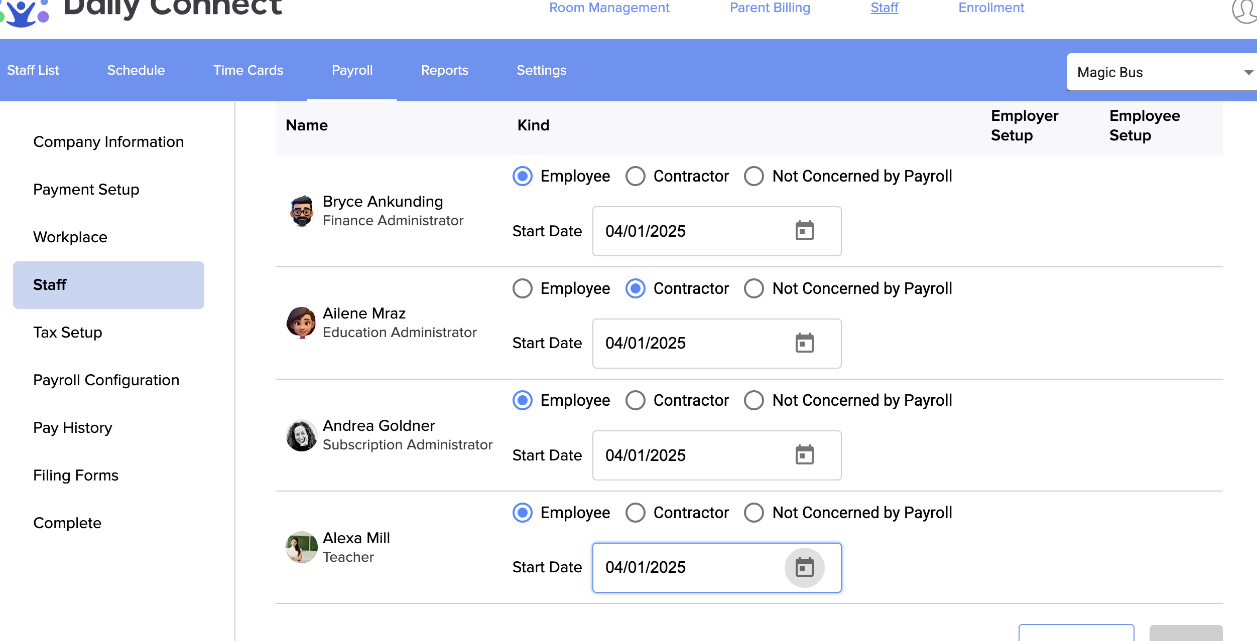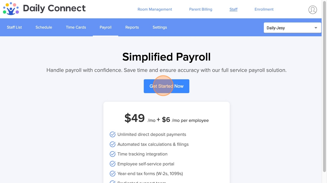 Pague fácilmente a sus empleados, gestione hojas de tiempo y administre impuestos, todo desde la misma plataforma que ya usa para operar su centro.