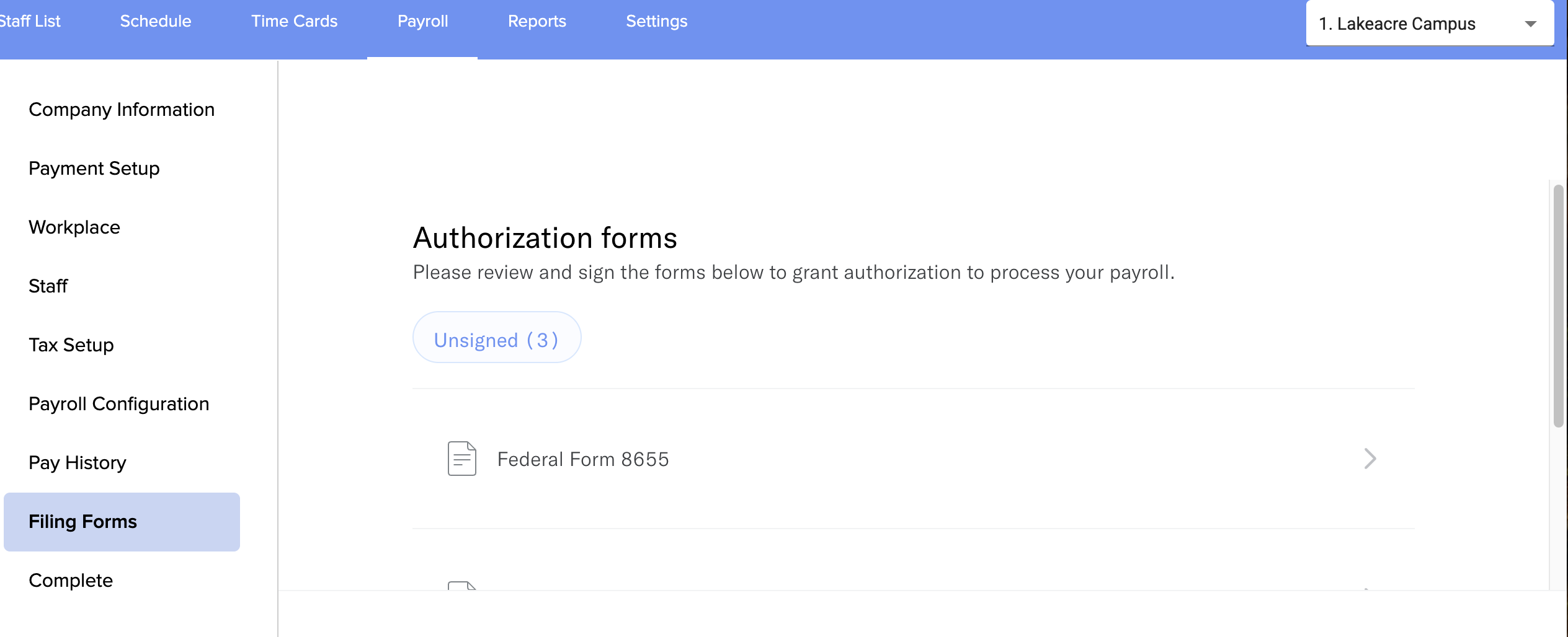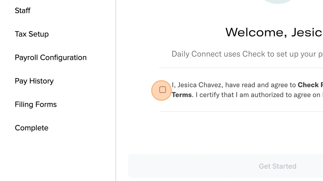 Firme los formularios en esta pantalla para otorgar a Daily Connect la autorización para procesar su nómina y enviar las declaraciones y pagos de impuestos en su nombre.