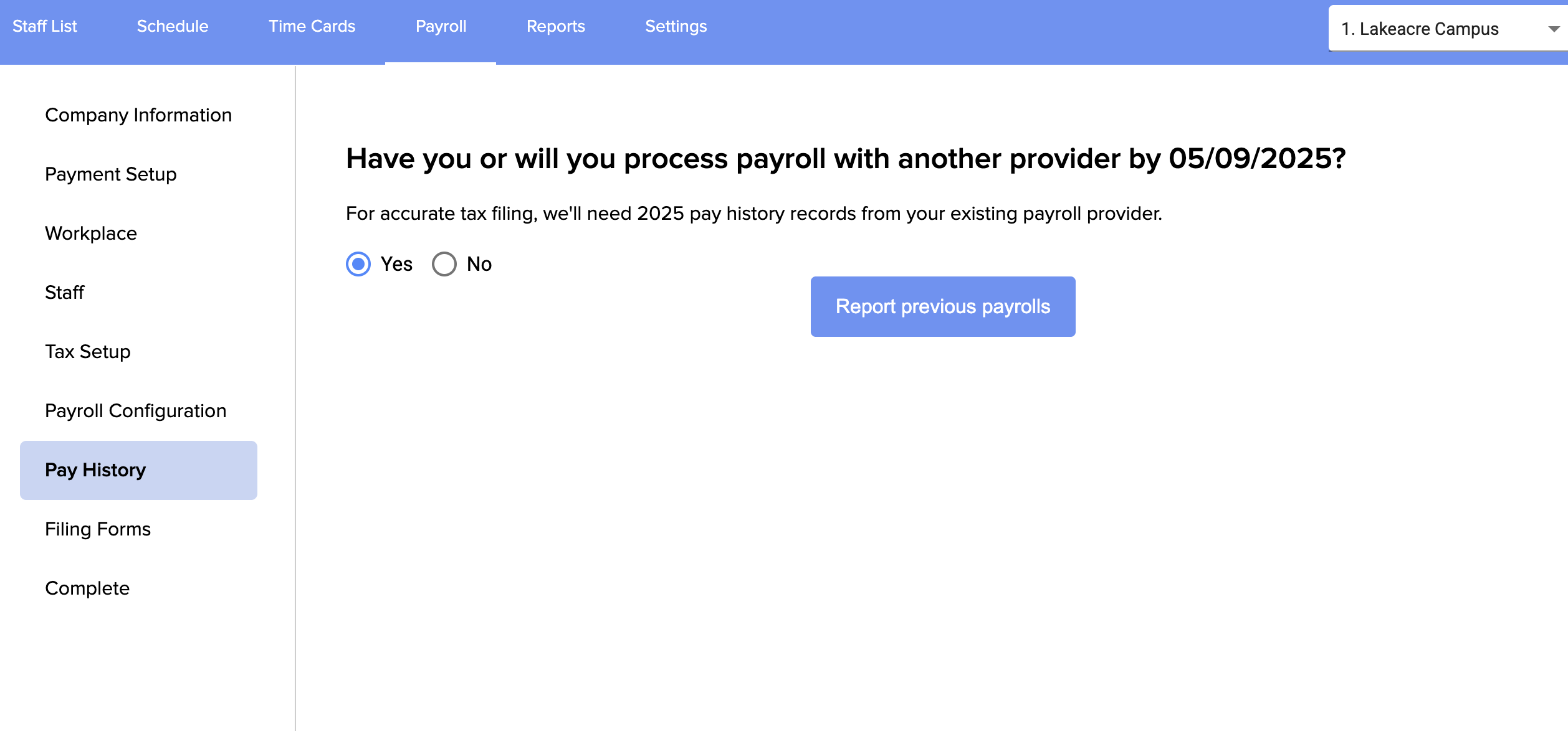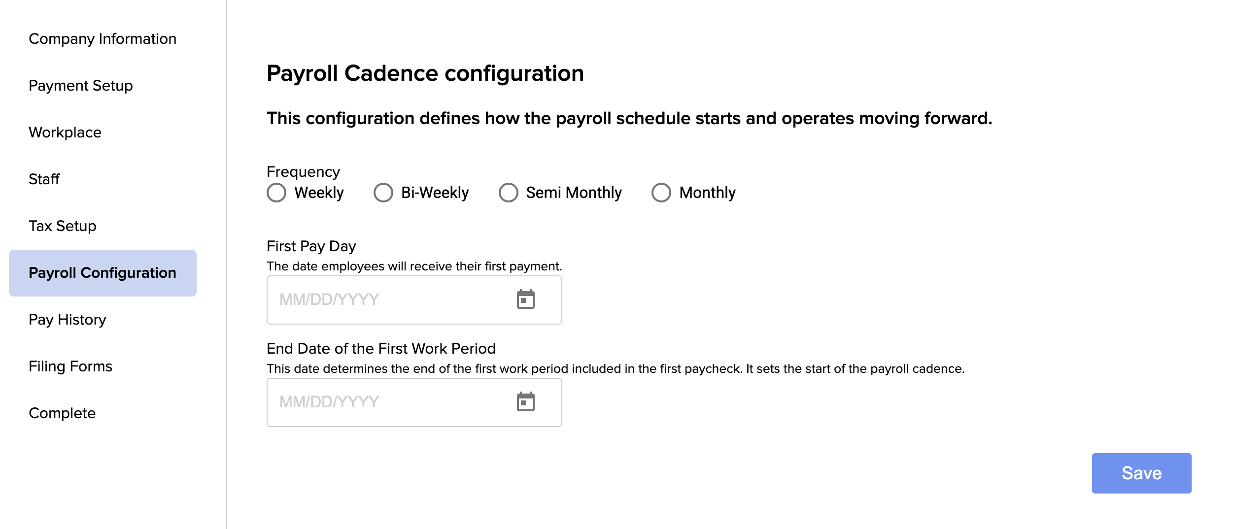 A continuación, elegirá su primer día de pago y la fecha de finalización del primer período. El día de pago debe ser al menos cinco días después de la fecha de finalización del período. Es común tener un retraso de una semana entre la fecha de finalización del período y el día de pago. Por ejemplo, si su período termina un viernes, sus empleados recibirán el pago el viernes siguiente.
