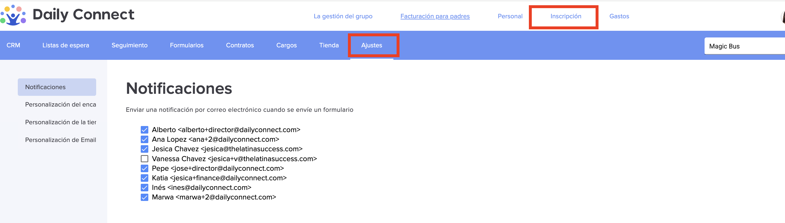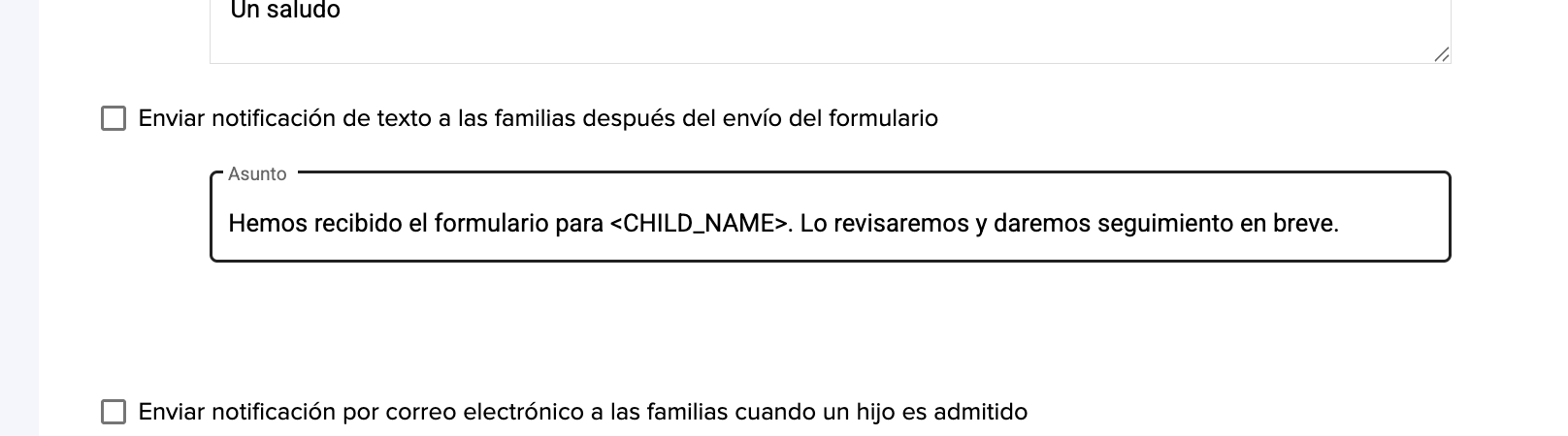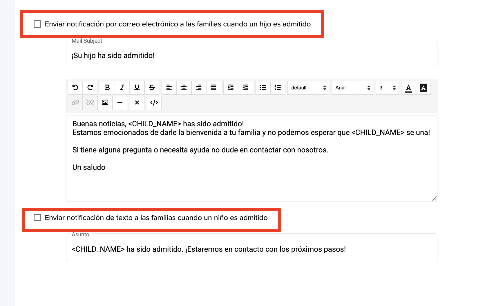 6. Configure el envío de un mail o SMS cuando un niño se inscriba en su centro: