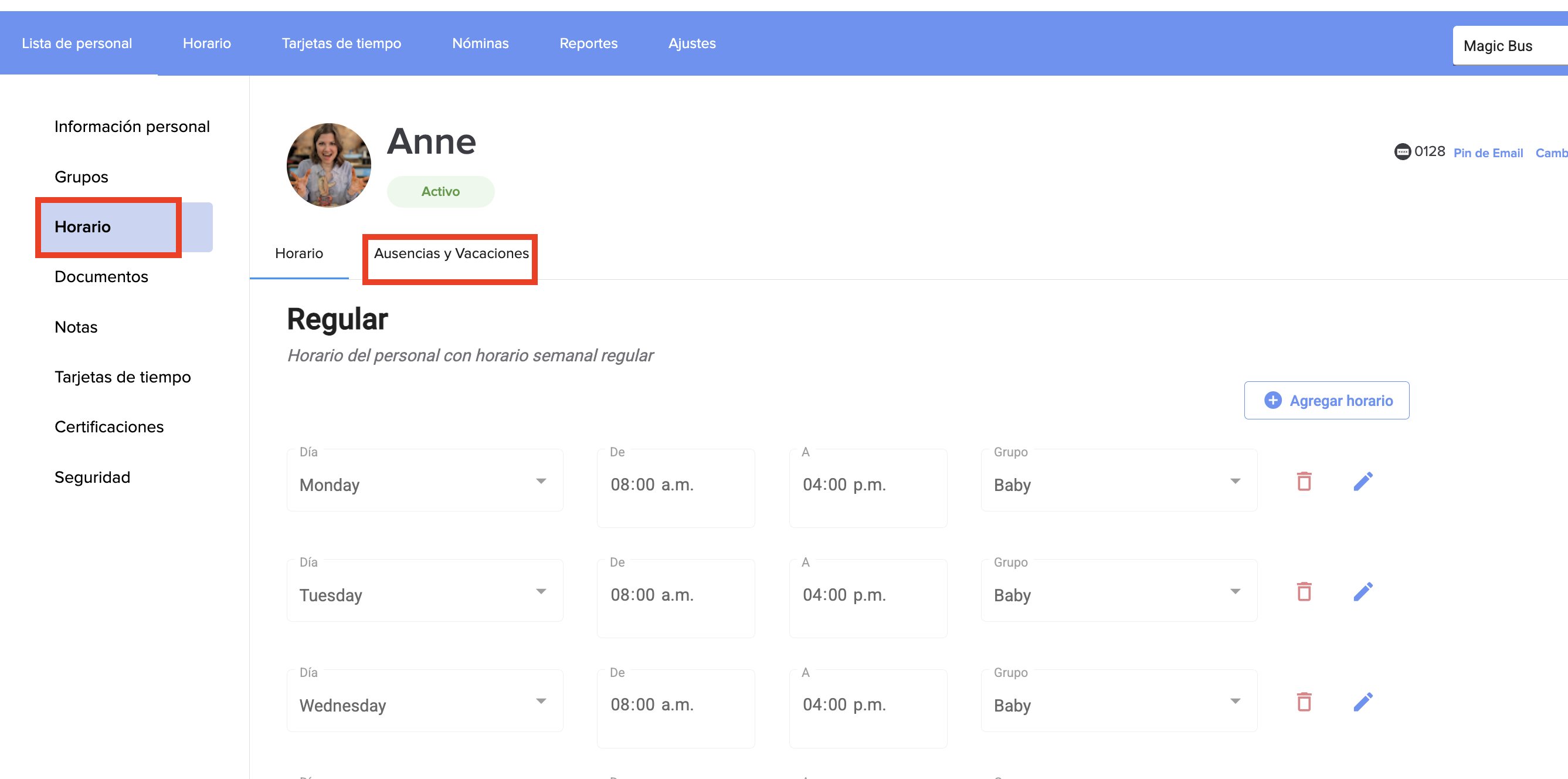 3. Haga clic en la sección de Horario y allí acceda a Ausencias y vacaciones: