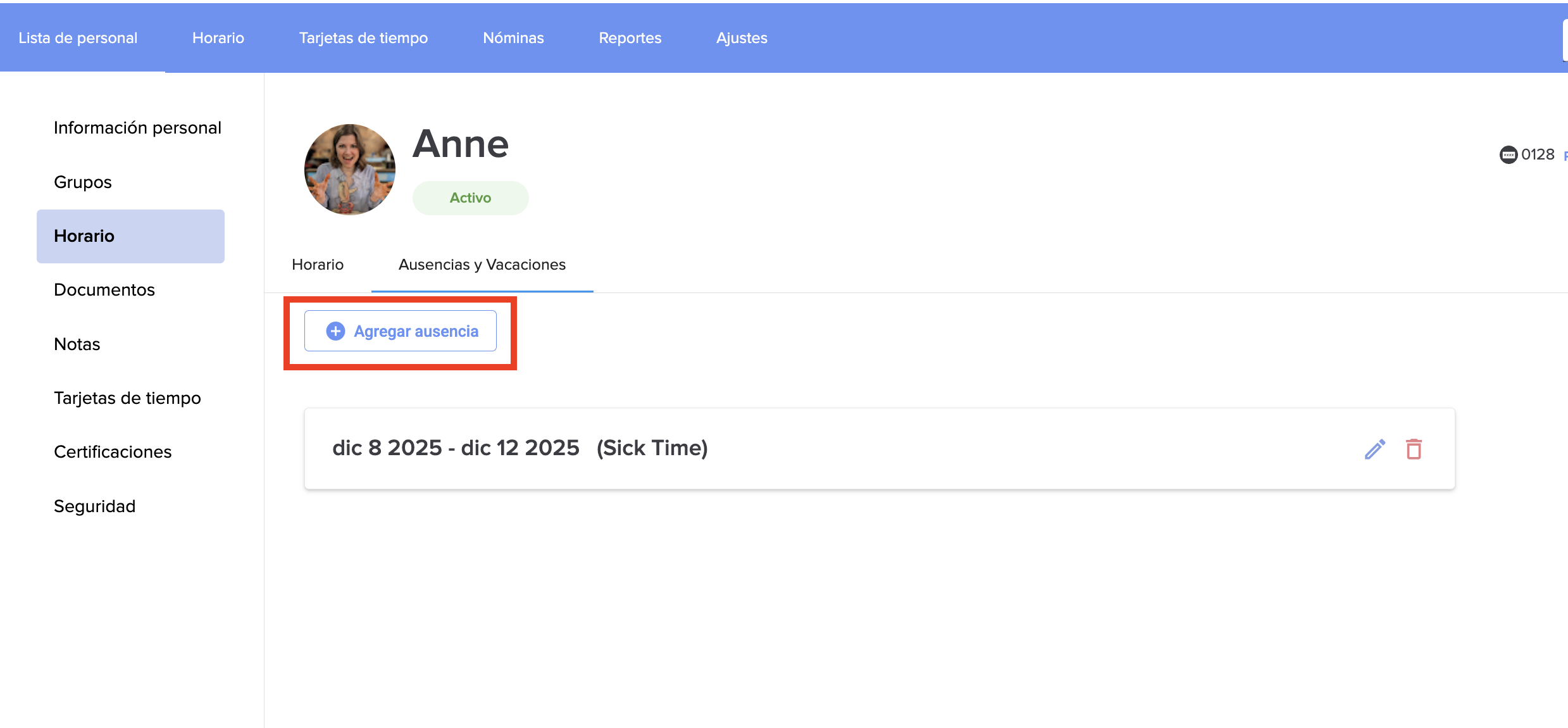 4. Para agregar una nueva ausencia haga clic en Agregar ausencia: