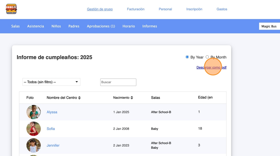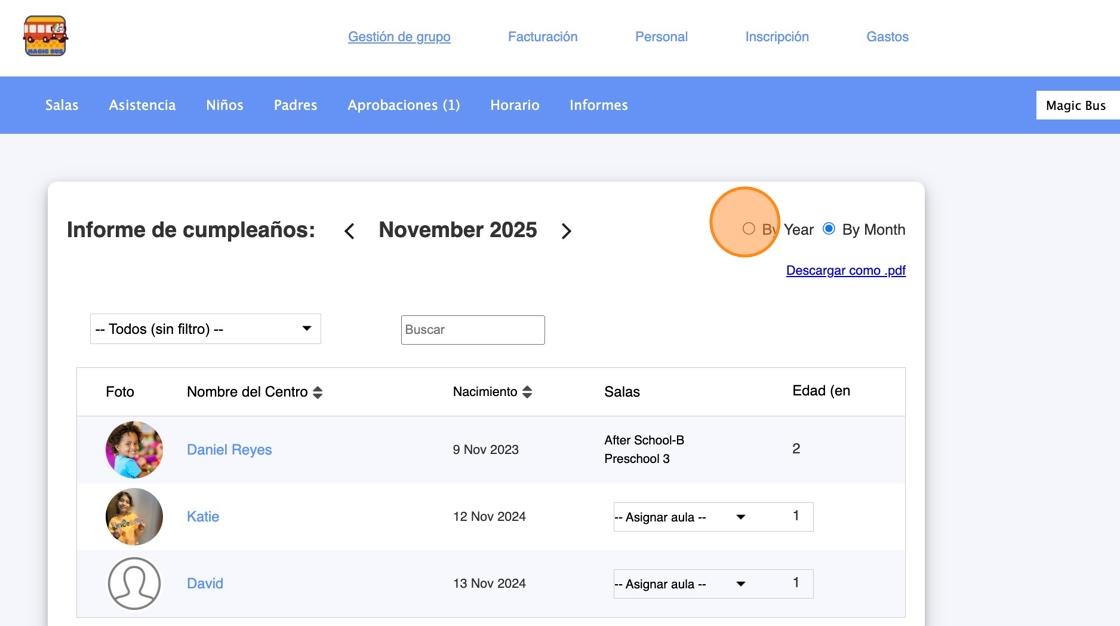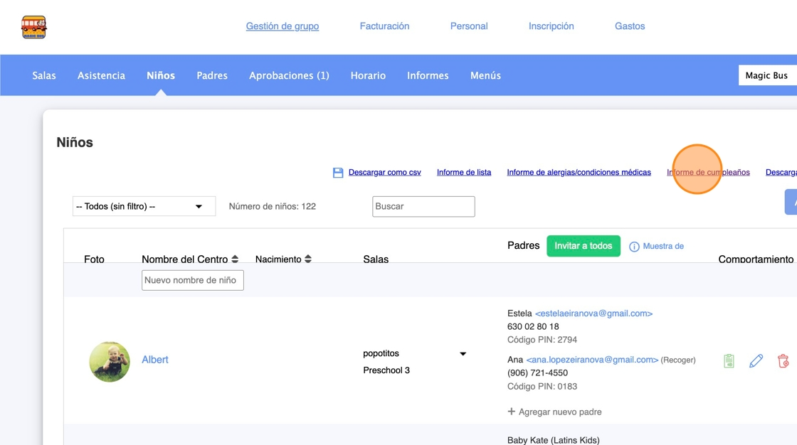Llevar un registro de los cumpleaños de los niños es un aspecto fundamental en la gestión de un centro educativo. Con Daily Connect, puede generar rápidamente un informe de cumpleaños para ver los próximos cumpleaños de un vistazo y asegurarse de que cada niño se sienta celebrado. Aquí le explicamos cómo acceder a él:
