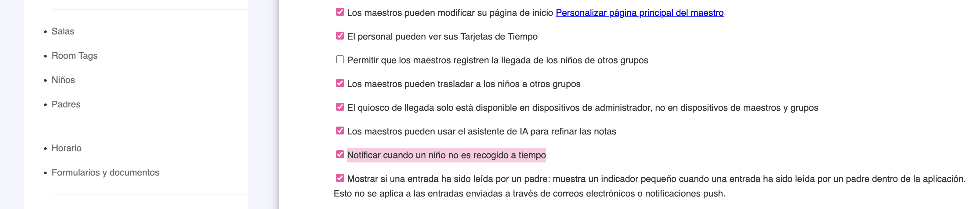 4. Marca la opción Notificar cuando un estudiante no es recogido a tiempo