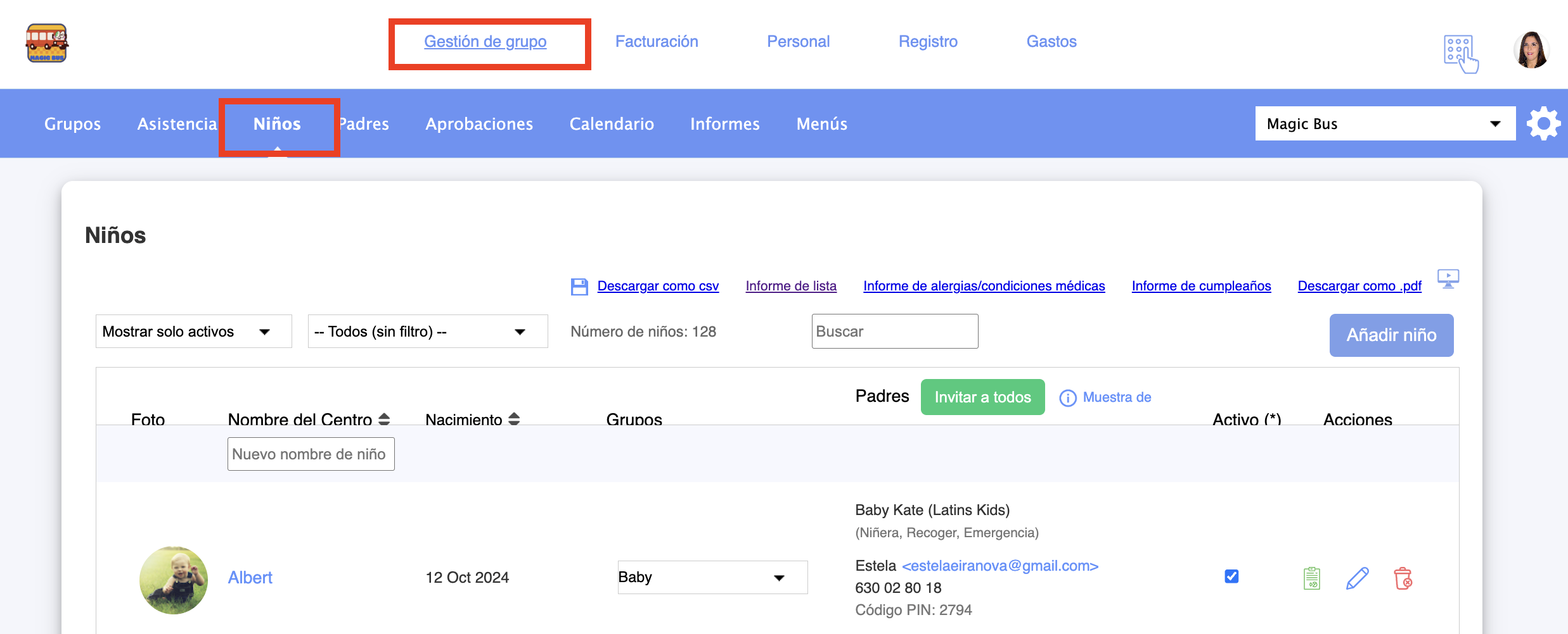 3. Seleccione al niño al que quiere aplicar el descuento y haga clic en Matrícula y pagadores: