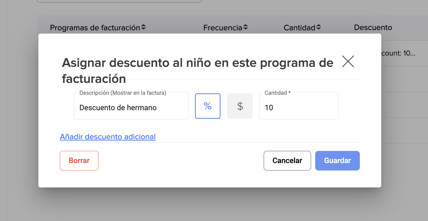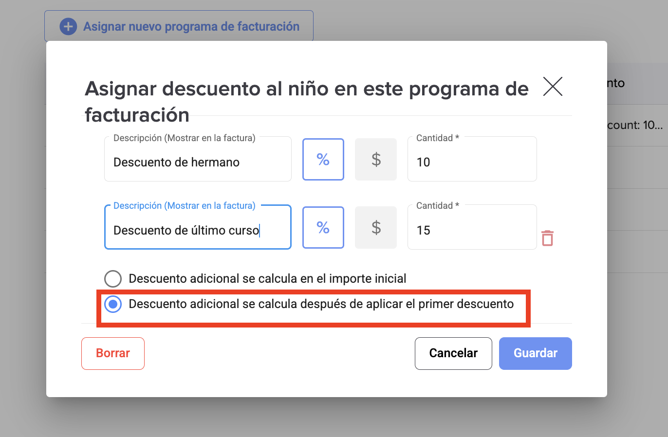 6. Puede añadir más descuentos al mismo plan de facturación haciendo clic en Añadir descuento adicional. Una vez añadido puede también decidir la forma en la que se aplicará este segundo descuento: