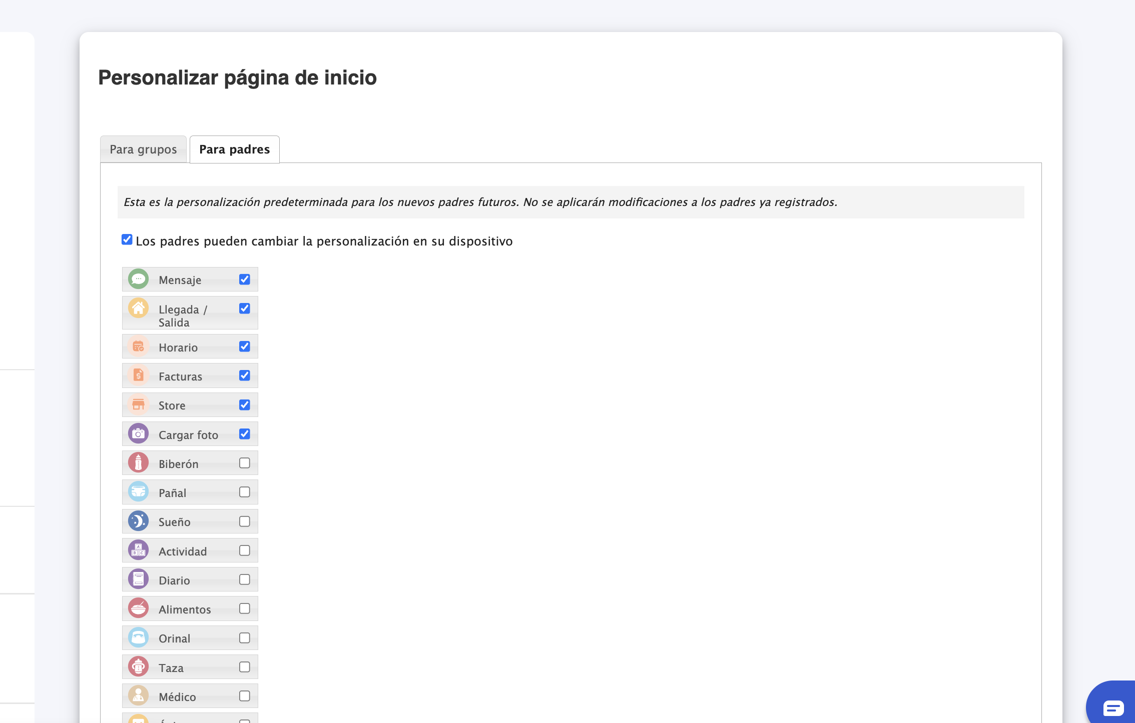 3. Haga clic en Para padres y seleccione los iconos que desee quitar o incluir: