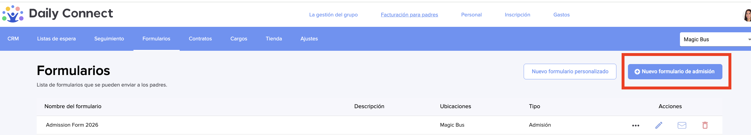 3. Para crear un nuevo formulario de admisión, haga clic en +Nuevo formulario de admisión.
