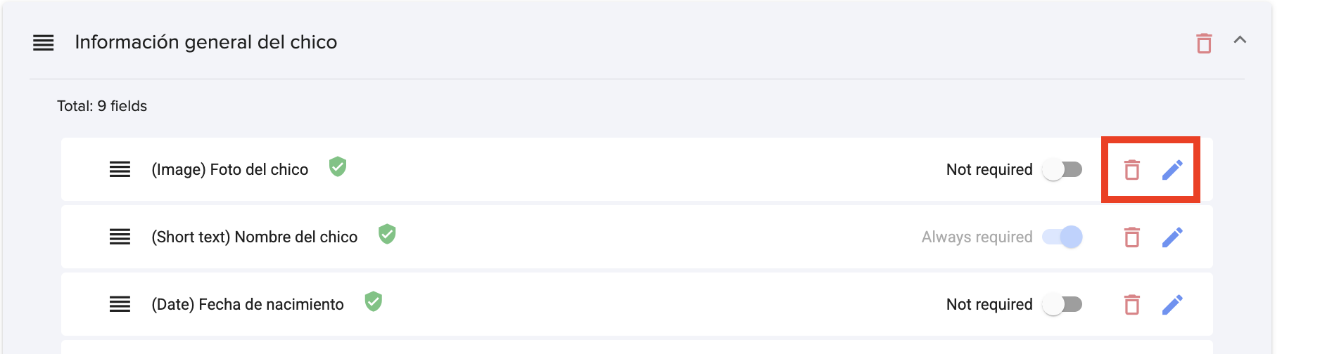 5. Si quiere eliminar una sección dentro de una pregunta, debe hacer clic en el icono de la papelera. Si quiere editarla, debe hacer clic en el icono del lápiz azul.