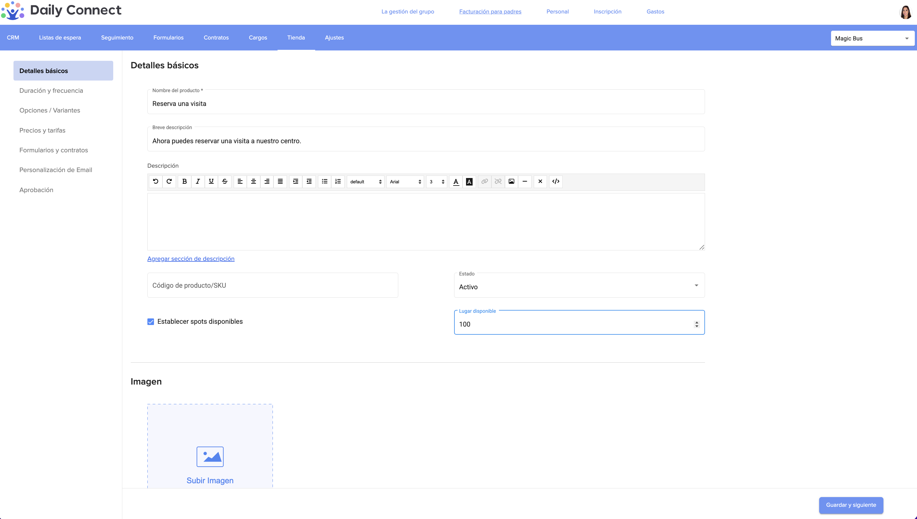 5. Complete toda la información básica y guárdela. En este caso, estamos creando un producto para reservar una visita al centro.