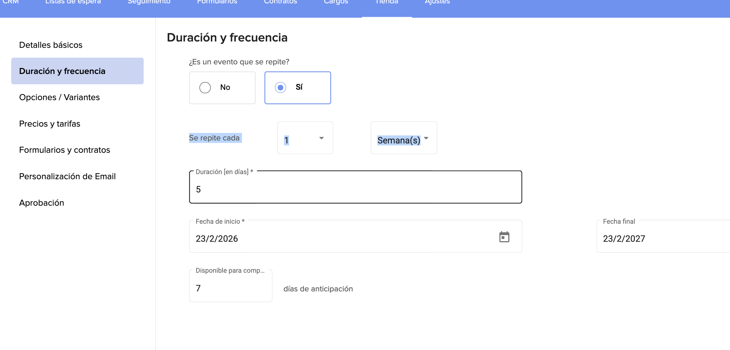 6. Complete la información relativa a la duración y frecuencia: