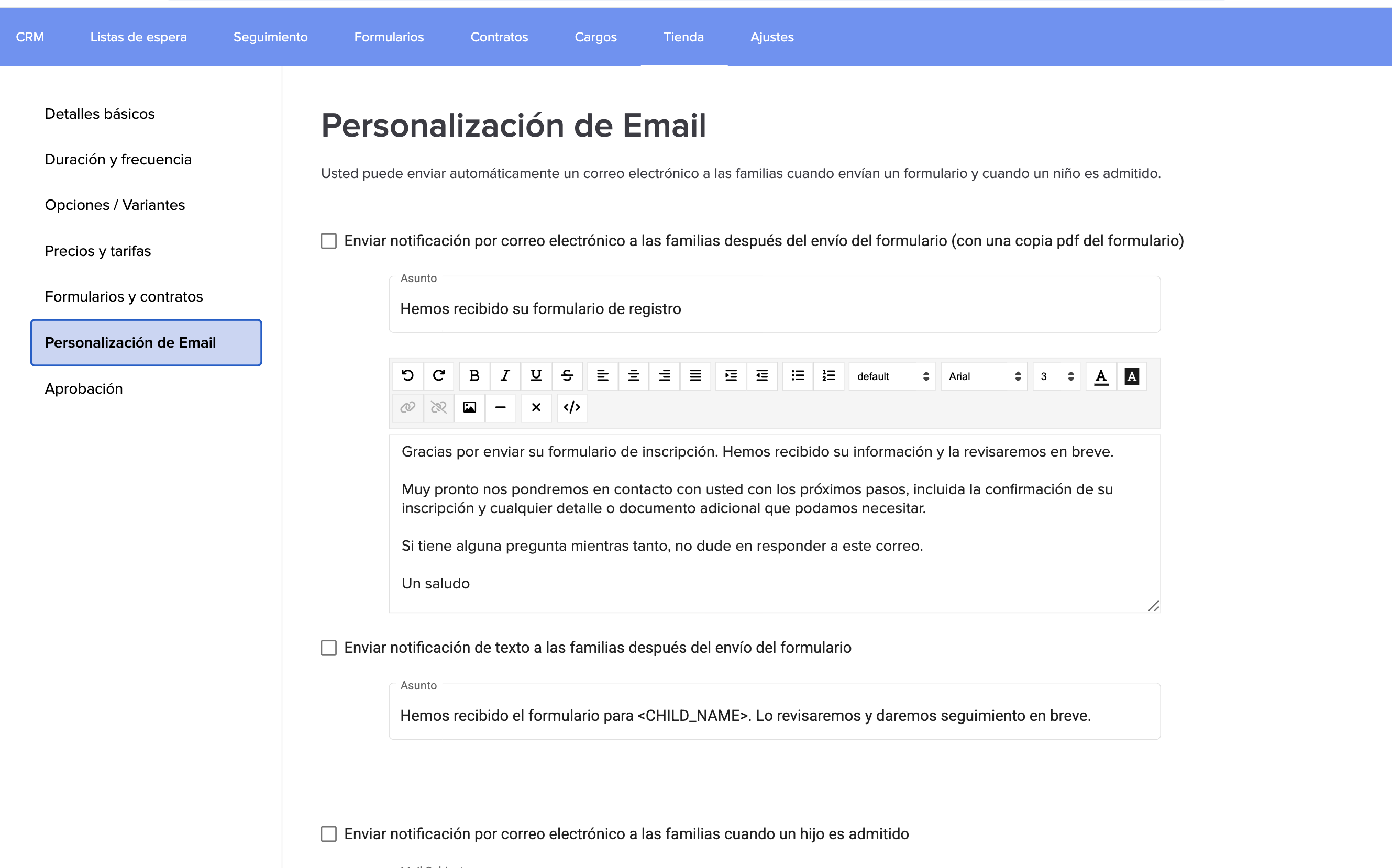 9. En la sección de personalización de correos electrónicos, puede personalizar los emails/SMS que los padres recibirán (si lo desea) cuando envíen el formulario y/o cuando el niño sea admitido: