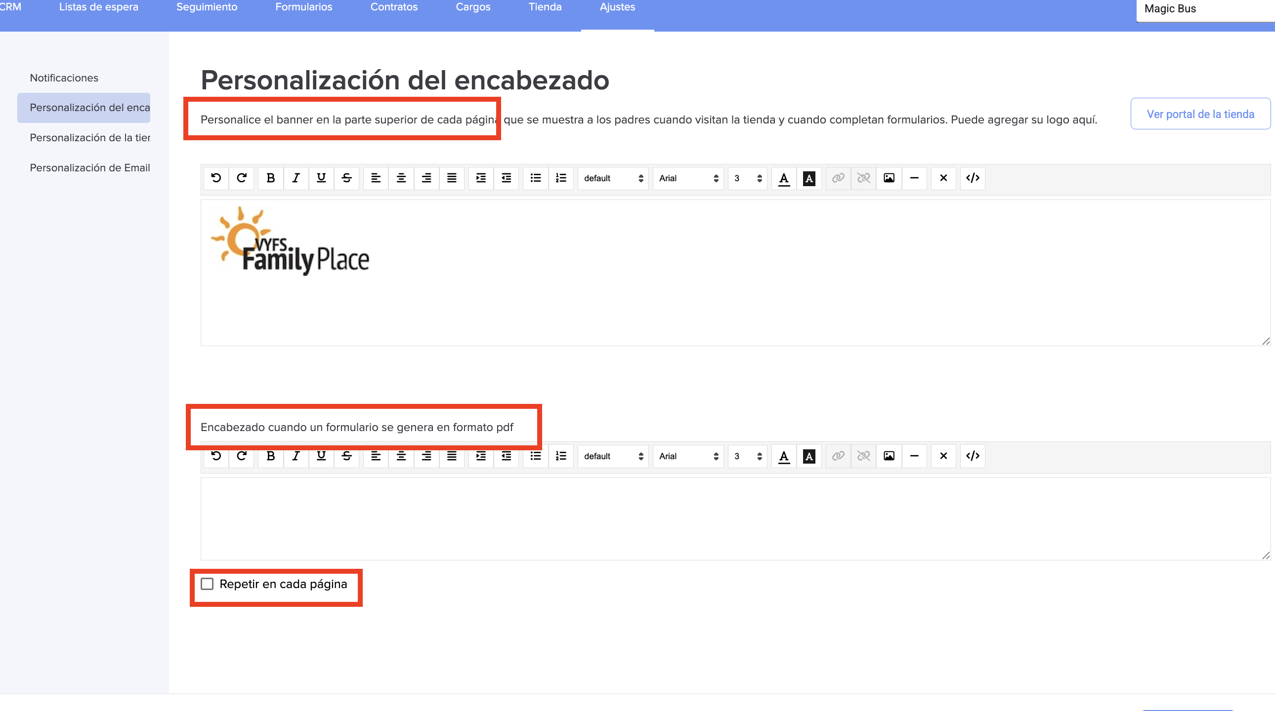 3. Vaya a Personalización del encabezado. Aquí puede personalizar la apariencia de cada página donde aparecerán sus formularios, y también agregar un logotipo, incluso si el formulario es en PDF. El logotipo se puede repetir en cada página si lo desea. Haga clic en Guardar.