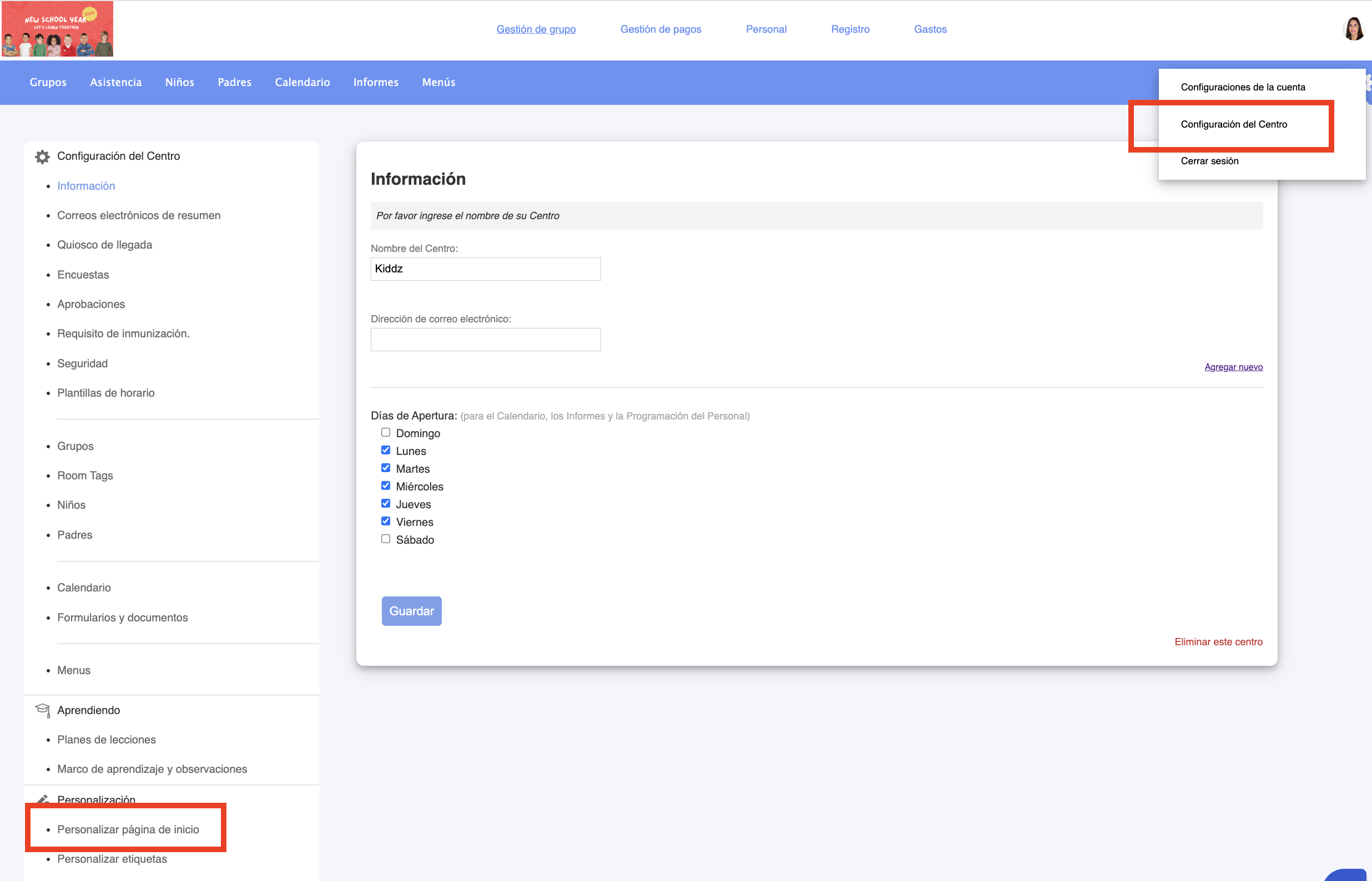 4. También puede acceder a Configuración del centro > Personalizar página de inicio: