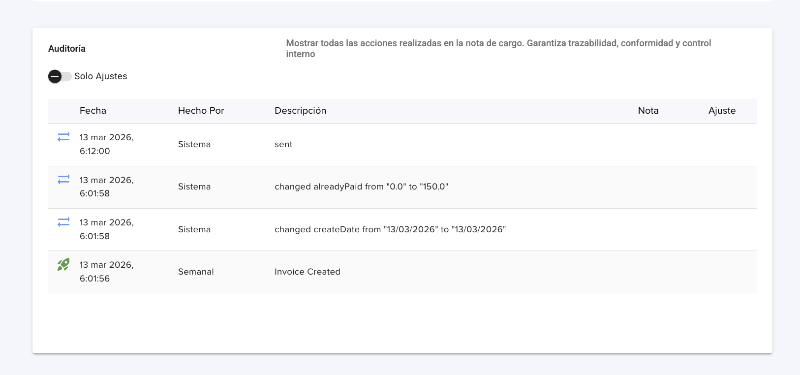 Ahora encontrará una auditoría en la parte inferior de cada nota de cargo, donde se muestra un historial detallado de los cambios realizados, incluidos actualizaciones, ediciones y ajustes.