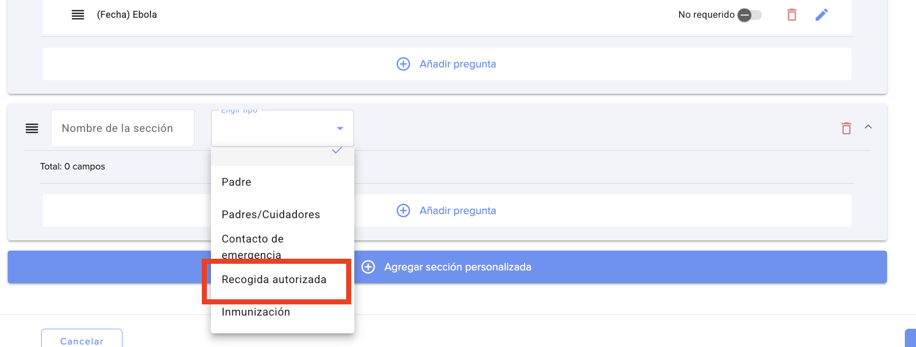 Sección de recogida autorizada: ahora puede agregar una sección de recogida autorizada generada por el sistema directamente en sus formularios de inscripción. Esta sección permite recopilar información detallada sobre los contactos autorizados para recoger a los niños y mapear automáticamente esos datos en Daily Connect.