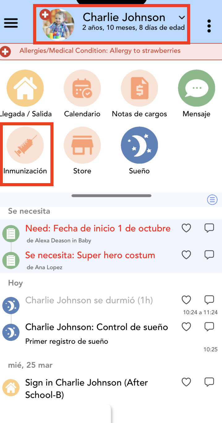 1. Inicie sesión en la app y haga clic en el icono de inmunización. Si tiene más de un hijo, recuerde seleccionar el correcto.
