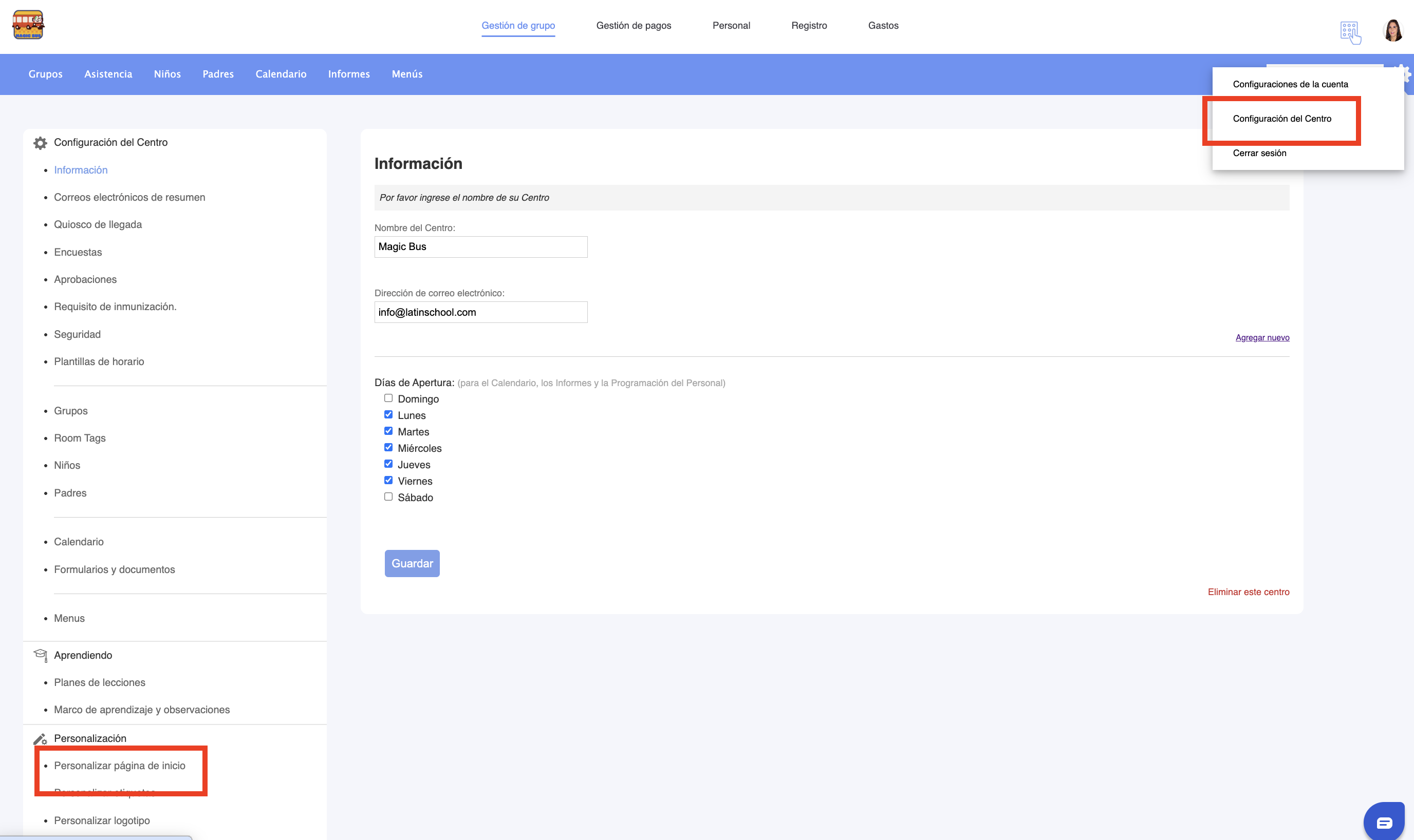 2. Haz clic en Configuración del centro > Personalizar página de inicio: