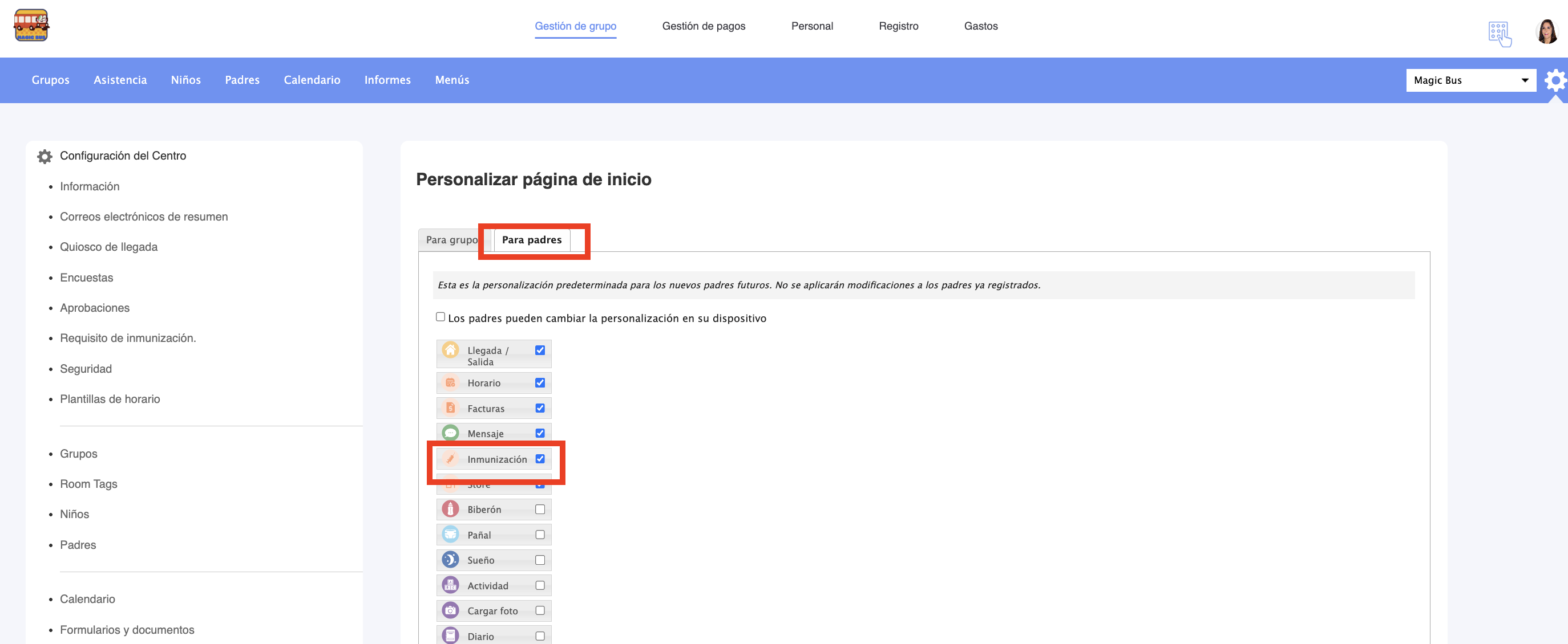 3. Haz clic en la pestaña de Para padres y habilita la opción de inmunización: